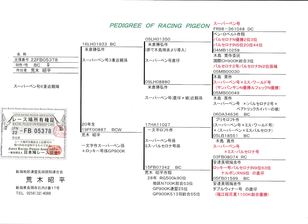 出品鳩♀26番「22RB05378 BC ♀」荒木昭平鳩舎作スーパーベン号6重近親鳩米倉作 スーパーベン号3重近親孫鳩(スーパーベン号直仔×スーパーベン号直仔同士の娘)×(スーパーベン号3重近親孫×地区N総合53位GP総合55位&ロッキー号バルセロナIN9位孫)娘鳩 との直仔です。 父親 ♂8番「16LH01933 BC ♂」米倉勝弘鳩舎作 スーパーベン号3重近親孫鳩 スーパーベン号直仔 ×(スーパーベン号・ミスワールド号の直仔×スーパーベン号の娘)娘鳩 との直仔です。 母親 ♀17番20年生「19FF00887 BCW」荒木正平鳩舎作 一文字ロフト作 スーハーベン号3重近親孫 ×地区N総合53位GP総合55位両親安達作(ロッキー号バルセロナIN9位直仔×福江桜花賞総合優勝娘)娘鳩 との直仔です。 詳しくは、添付の血統書の参照をお願いいたします。 <備考> 現在管理人の鳩舎で元気に過ごしています。写真は1/14日に撮影しました。 菅原明鳩舎の概要はこちらをご覧ください |