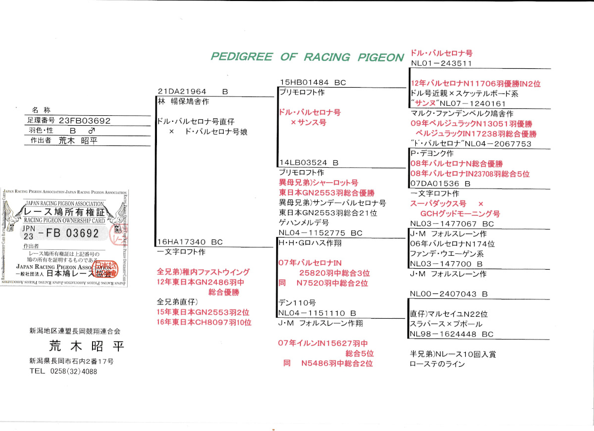 出品鳩♂47番「23FB03692 B ♂」荒木昭平鳩舎作 林作両親プリモ作(ドルバルセロナ号バルセロナN優勝&サンヌ号ベルジュラックIN総合優勝直仔×一文字作 稚内ファストウィング号12年東日本GN総合優勝全兄弟(ゲハメンデ号バルセロナIN3位×デン110号イルンN2位IN5位)鳩 との直仔です。 父親 ♂24番「21DA21964 B ♂」林 暢保鳩舎作 両親プリモ作(ドルバルセロナ号バルセロナN優勝IN25348羽総合2位×サンヌ号ベルジュラックIN17238羽総合優勝)直仔×シャーロット号東日本GN総合優勝の異母兄弟(ド・バルセロナ号バルセロナN優勝IN5位の娘)娘鳩 との直仔です。 母親 「16HA17340 BC」一文字ロフト作 全兄弟に 稚内ファストウィング号12年東日本GN2486羽総合優勝鳩がいる ゲハメルデ号バルセロナIN3位×デン110号イルンN2位IN5位鳩 との直仔です。 詳しくは、添付の血統書の参照をお願いいたします。 <備考> 振込または、現金書留でお願いします。 菅原明鳩舎の概要はこちらをご覧ください |