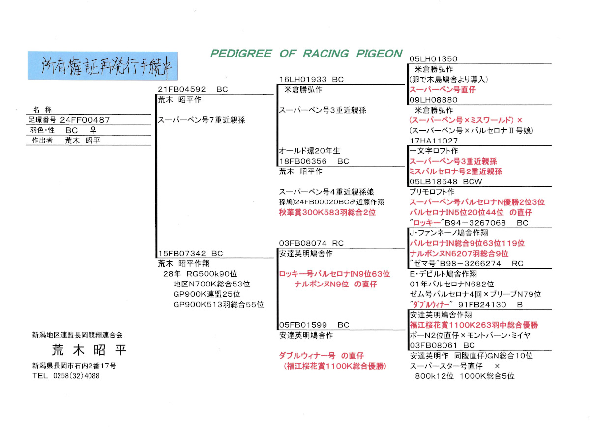 出品鳩♀64番「24FB00487 BC ♀」荒木昭平鳩舎作スーパーベン号7重近親鳩(米倉作スーパーベン号3重近親孫鳩×スーパーベン号4重近親孫)×地区N700K総合53位GP900K連盟25位513羽総合55位鳩&ロッキー号バルセロナIN9位63位113位孫鳩 との直仔です。 父親 ♂33番「21FB04592 BC ♂」荒木昭平鳩舎作スーパーベン号7重近親鳩 米倉作スーパーベン号3重近親孫鳩(スーパーベン号直仔×スーパーベン号直仔同士の娘)×スーパーベン号4重近親孫(スーハーベン号3重近親孫×スーパーベン号娘鳩)との直仔です。 母親 ♀2番「15FB07342 BC ♀」荒木昭平鳩舎作翔地区N700K総合53位GP900K連盟25位513羽総合55位鳩で 両親安達作ロッキー号ファンネーノ作翔バルセロナIN9位63位113位ナルボンヌN9位直仔×ダブルウィナー号福江桜花賞1000K総合優勝の娘鳩 との直仔です。 詳しくは、添付の血統書の参照をお願いいたします。 ※当該鳩の「所有権証」粉失したため現在再発行手続き中です。 <備考> 振込または、現金書留でお願いします。 菅原明鳩舎の概要はこちらをご覧ください |