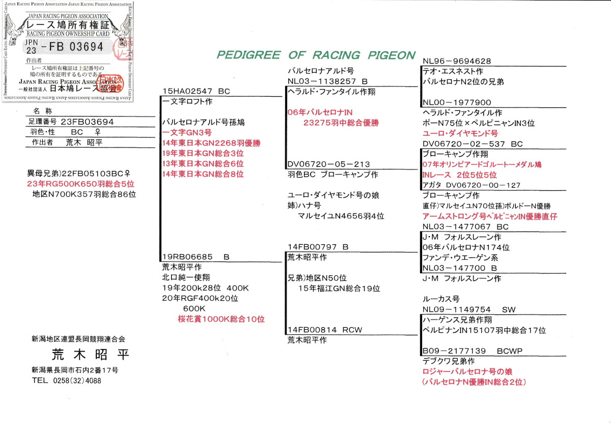 出品鳩♀29「23FB03694 BC♀」荒木昭平作全兄弟)RG500K総合5位 一文字作バルセロナアルド号直仔×1000K桜花賞8位総合10位&ルーカス号孫 ![]() |