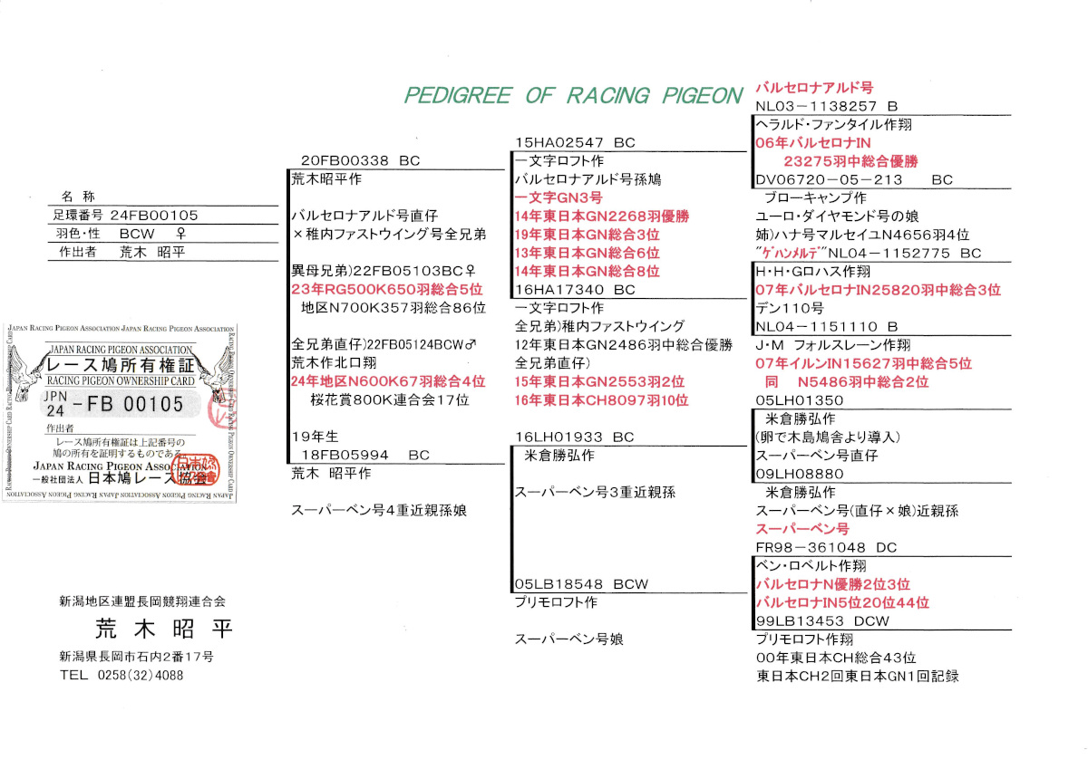 出品鳩♀37番「24FB00105 BCW ♀」荒木昭平鳩舎作RG500K650羽総合5位異母兄弟(バルセロナ・アルド号直仔×稚内ファストウィング号兄弟)×スーパーベン号4重近親孫鳩(スーパーベン号3重近親孫鳩×スーパーベン号娘鳩) との直仔です。 父親 ♂19番「20FB00338 BC」荒木昭平鳩舎作 異母兄弟にRG500K650羽総合5位鳩がいる 両親一文字作バルセロナ・アルド号バルセロナIN総合優勝直仔×稚内ファストウィング号12年東日本GN2486羽総合優勝の全兄弟鳩 との直仔です。 母親 ♀11番19年生「18FB05994 BC ♀」荒木昭平鳩舎作 スーパーベン号4重近親孫鳩(スーパーベン号3重近親孫鳩×スーパーベン号娘鳩) 詳しくは、添付の血統書の参照をお願いいたします。 <備考> 振込または、現金書留でお願いします。 菅原明鳩舎の概要はこちらをご覧ください |