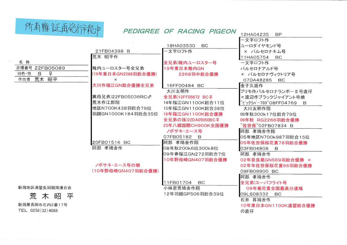出品鳩♀24番「22FB05089 B ♀」荒木昭平鳩舎作羽越GN1000K184羽総合35位異母兄弟(稚内ユーロスター号GN総合優勝鳩全兄弟×大川作福江GN1100K総合優勝全兄弟)直仔×阿部作ノボサキエース号野母崎GN407羽総合優勝の娘)娘鳩 との直仔です。 父親 ♂32番「21FB04398 B ♂」荒木昭平鳩舎作異母兄弟に地区N700K総合79位羽越GN1000K184羽総合35位鳩がいる 一文字ロフト作稚内ユーロスター号GN総合優勝鳩全兄弟鳩×大川作16年福江GN1100K総合優勝の全兄弟鳩 との直仔です。 母親 「20FB01516 BC」阿部 孝鳩舎作 ノボサキエース号野母崎GN407羽総合優勝福江GN総合7位鳩 × 小林作翔羽越GP506羽総合39位鳩 との直仔です。 詳しくは、添付の血統書の参照をお願いいたします。 ※当該鳩の「所有権証」粉失したため現在再発行手続き中です。 <備考> 現在管理人の鳩舎で元気に過ごしています。写真は1/14日に撮影しました。 菅原明鳩舎の概要はこちらをご覧ください |