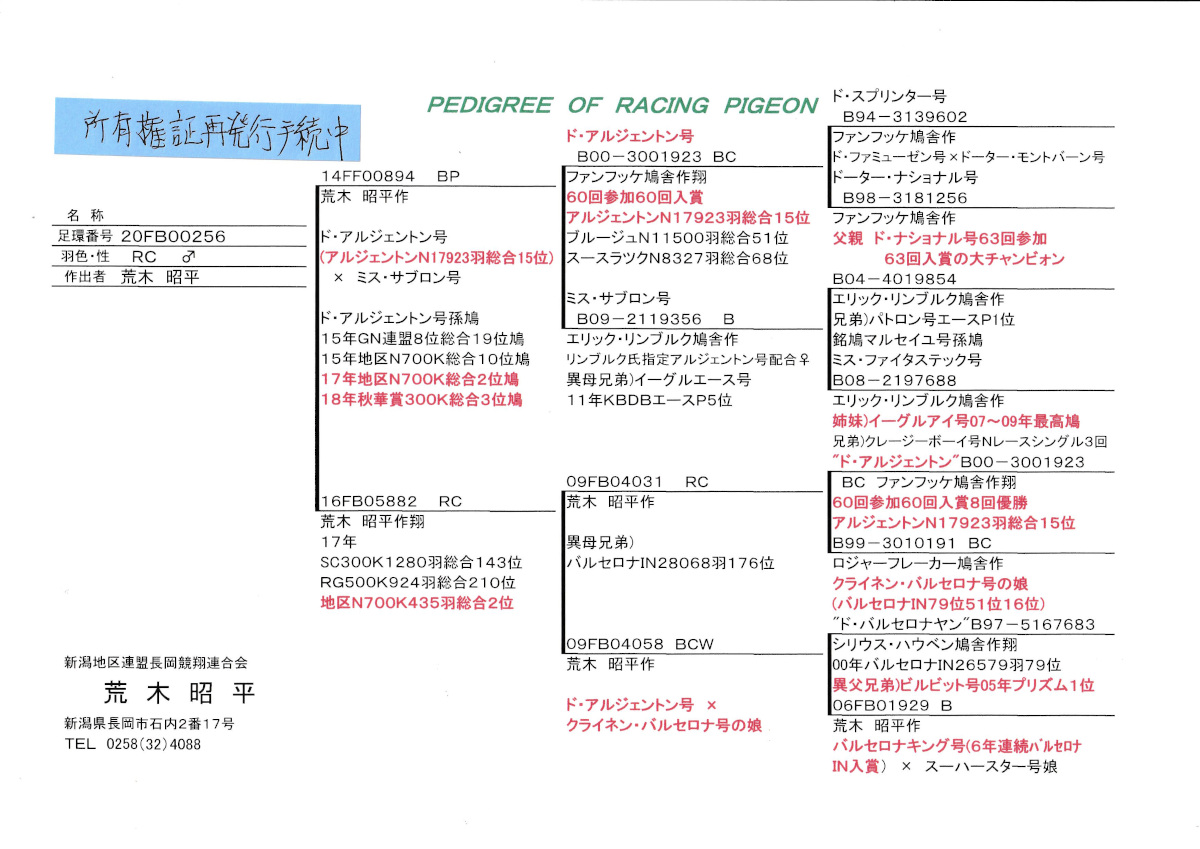 出品鳩♂17番「20FB00256 RC ♂」荒木昭平鳩舎作ド・アルジェントン号60回参加60回入賞8回優勝 アルジェントンN17923羽総合15位直仔×地区N700K435羽総合2位(ハウベン作翔バルセロナヤン号バルセロナIN26579羽79位直仔×ド・アルジェントン号の娘)娘鳩 との直仔です。 父親 「14FF00894 BP」荒木正平鳩舎作 ド・アルジェントン号60回参加60回入賞5回優勝 アルジェントンN17923羽総合15位×ミスサブロン号リンブルク作ーイーグルエース号異母兄弟鳩 との直仔です。 母親 ♀4番「16FB05882 RC ♀」荒木昭平鳩舎作翔RG500K924羽総合210位地区N700K435羽総合2位鳩でハウベン作翔バルセロナヤン号バルセロナIN26579羽79位直仔×ド・アルジェントン号アルジェントンN17923羽15位の娘鳩 との直仔です。 詳しくは、添付の血統書の参照をお願いいたします。 <備考> 現在管理人の鳩舎で元気に過ごしています。写真は1/14日に撮影しました。 菅原明鳩舎の概要はこちらをご覧ください |