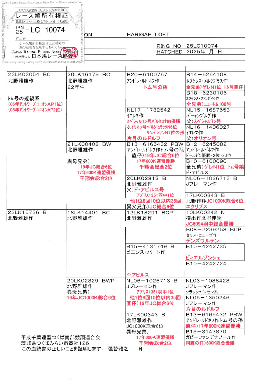 出品鳩若107番「25LC10074 B」張替雅之鳩舎作両親北野作(トム号&スペシャルワン号&オリオン号系X片眼のルドルフ号&ドアビルス号の娘)直仔×(エクリプス号JC6094羽総合優勝孫XJC総合6位の異母兄弟&ドアビルス号娘&JC総合6位娘鳩 との直仔です。 父親 「23LK03054 BC」北野雅雄鳩舎作(トム号の孫Xスペシャルワン号バルセロナIN総合優勝鳩&オリオン号の孫)直仔X片眼のルドルフ号娘&ドアビルス号アプリス13651羽優勝鳩&JC総合6位の娘)娘鳩 との直仔です 母親 「22LK15736 B」北野雅雄鳩舎作 (エクリプス号JC6094羽総合優勝直仔×ピエンスバート作鳩)直仔XJC総合6位の異母兄弟(ドアビルス号アプリス13651羽優勝鳩XJC総合6位&片眼のルドルフ号の娘)鳩 との直仔です。 詳しくは、添付の血統書の参照をお願いいたします。 <備考> 現在管理人の鳩舎で元気に過ごしています。写真は1/19日に撮影しました。 菅原明鳩舎の概要はこちらをご覧ください |