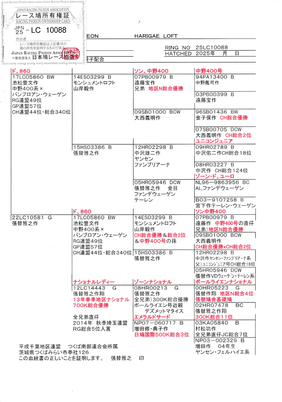 出品鳩若115番「25LC10088 G」張替雅之作ド860号池松作翔RG総合49位GP総合57位東日本CH総合340位×(ド860号×ナショナルレディ号PN700k総合優勝) ![]() |