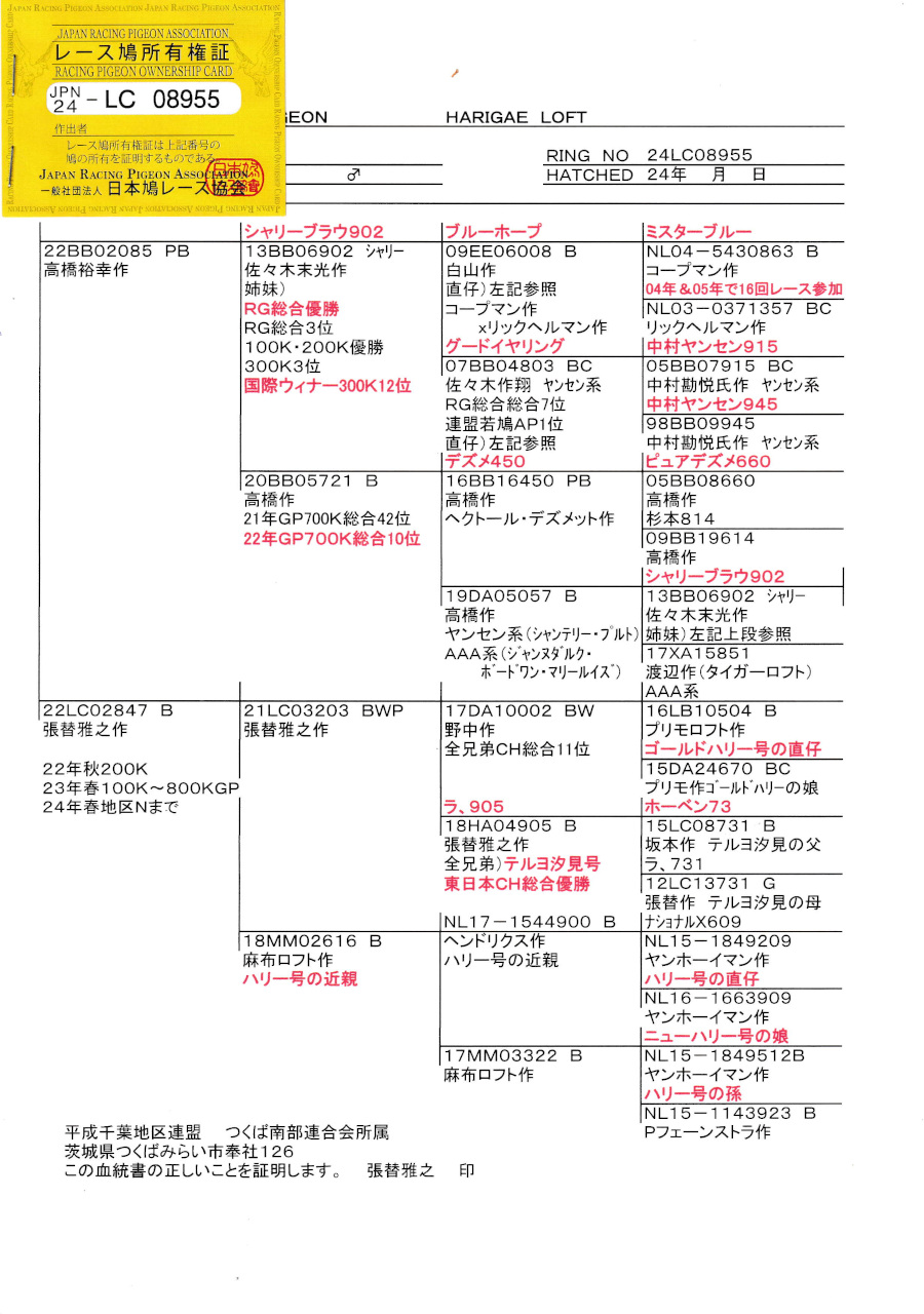 出品鳩♂36番「24LC08955 B ♂」張替雅之鳩舎作(佐々木作シャリーフラウ902号RG総合優勝総合3位全兄弟×ヘクトールデズメ・ヤンセン系GP700K総合10位)直仔×GP800K迄(テルヨ汐見号全兄弟の直仔×ハリー号近親)娘鳩との直仔です。 父親 「22BB02085 PB」高橋裕幸鳩舎作 佐々木作シャリーフラウ902号RG総合優勝総合3位全兄弟号(白山作コープマン作ミスターブルー号直仔×ヤンセン系RG総合7位若鳩AP1位)直仔×ヘクトールデズメ・ヤンセン系GP700K総合10位鳩 との直仔です。 母親 「22LC02847 B」張替雅之鳩舎作翔 23年GP800K迄24年地区N600K迄 テルヨ汐見号東日本CH総合優勝全兄弟の直仔×麻布作(ハリー号近親孫×ニューハリーの孫)娘鳩との直仔です。 詳しくは、添付の血統書の参照をお願いいたします。 <備考> 現在管理人の鳩舎で元気に過ごしています。写真は1/19日に撮影しました。 菅原明鳩舎の概要はこちらをご覧ください |