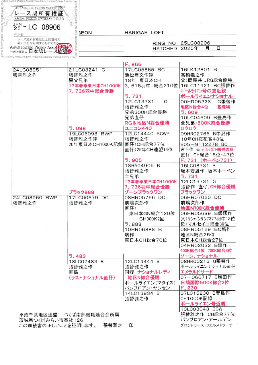 出品鳩若12番「25LC08906 BW」張替雅之作(テルヨ汐見号CH総合優勝半兄弟×CH帰還鳩&テルヨ汐見全兄弟娘)×(CH総合70位直仔×CH総合77位娘) ![]() |