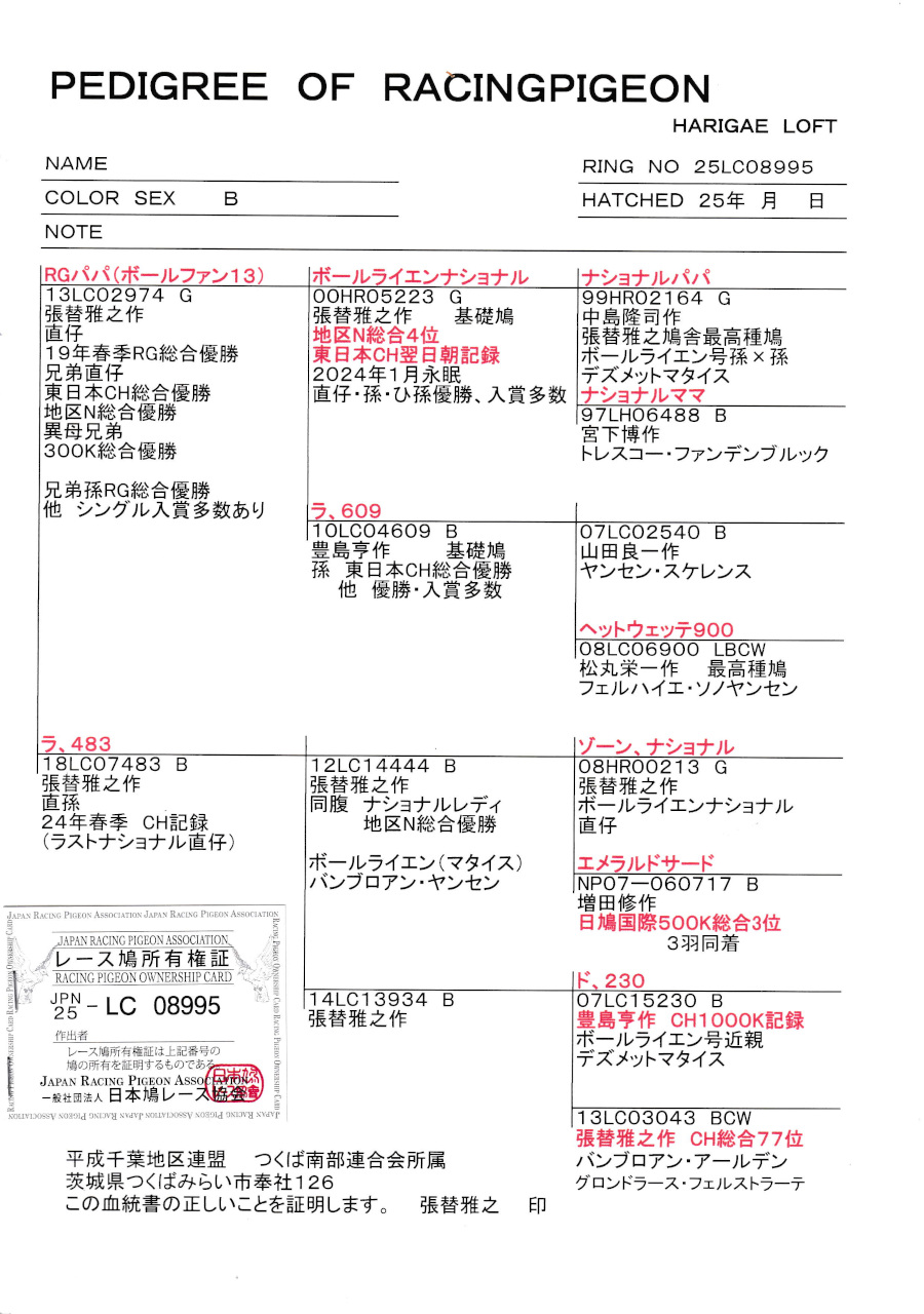 出品鳩若49番「25LC08995 B」張替雅之作半兄弟)沼宮内RG2549羽総合優勝(基礎鳩ボールエンナショナル号直仔×基礎鳩ボールエンナショナル号近親) ![]() |