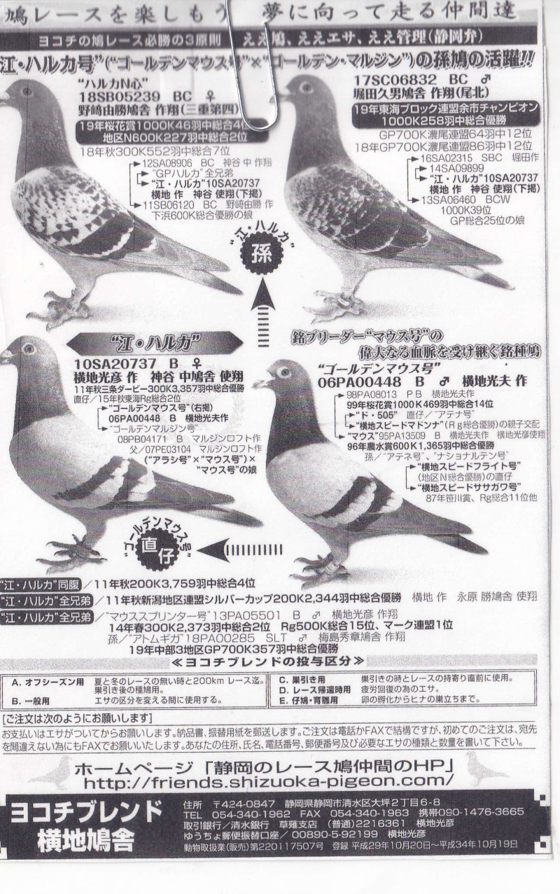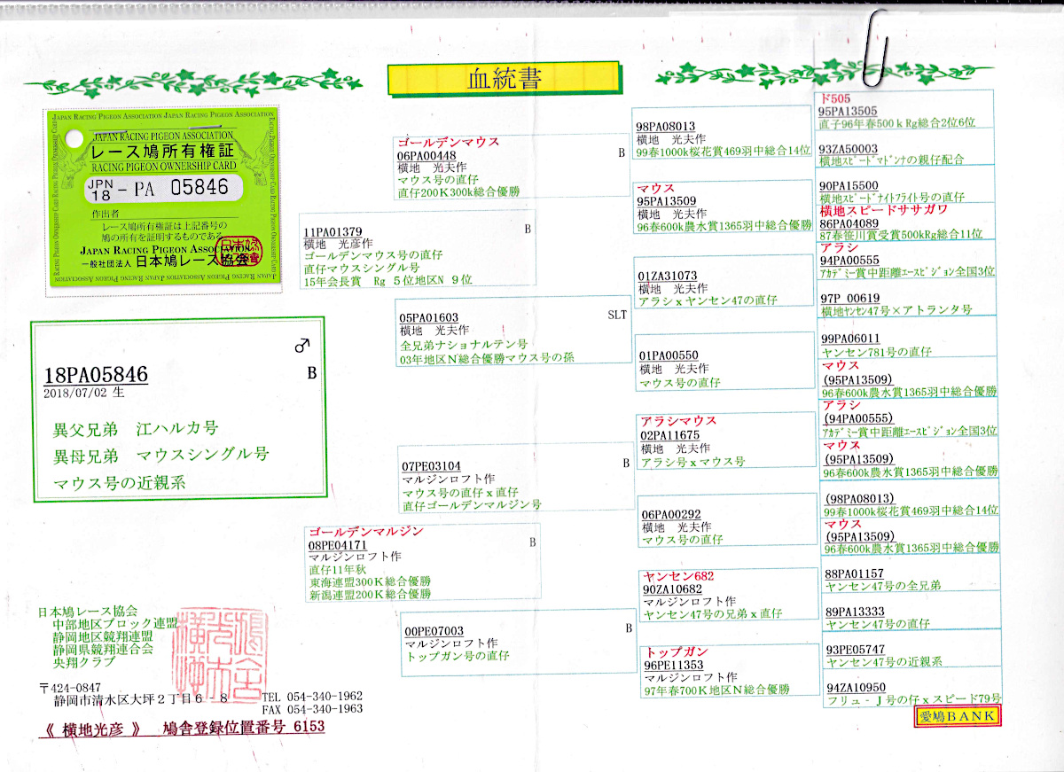 出品鳩「18PA05846 B♂」横地作半兄弟)マウスシングル号江ハルカ号 マウス号600K総合優勝近親孫×ゴールデンマルジン号(マウス号近親孫×トップガン号の娘) ![]() |