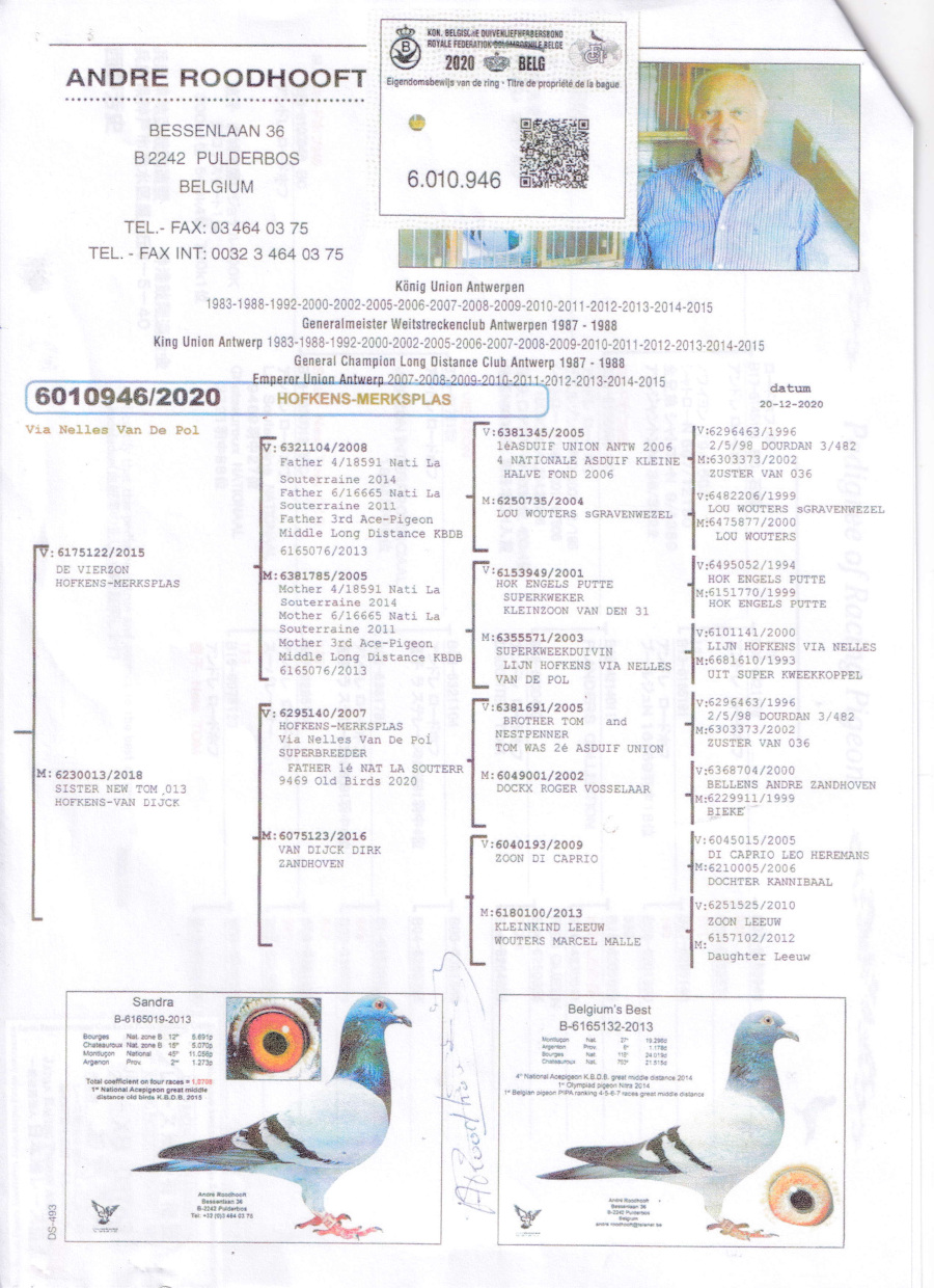 出品鳩「25XB03763 SW ♀」西野芳史鳩舎作純ロードホフ系 異父兄弟に矢口アスリート他委託300K400K700K各優勝500k4位鳩がいる (ノワイヨン1502羽79位シャトローN697位×シャトローN214位)直仔×(ヴィエルゾンIP9位×ラステレーヌN27位シャトローN88位)娘鳩 との直仔 父親 ”ロードホフ167号”「24XB06167 S」西野芳史鳩舎作 両親A・ロードホフ鳩舎作翔 ノワイヨン1502羽79位シャトローN12150羽697位鳩&シャトローN4379羽9位全兄弟×ビェルゾン185羽2位シャトロー506羽N22196羽214位鳩(キッテル号全兄弟の孫 ×代表鳩トム号の娘)鳩 との直仔です。 母親 ”ロードホフ946号”「B20−6100946 BC」A・ロードホフ鳩舎作 直仔に矢口アスリート他委託300K400K700K各優勝500k4位鳩がいる ヴィエルゾンIP1854羽9位×ラステレーヌN9469羽27位シャトローN2721羽88位鳩 との直仔です。 詳しくは、血統書を参照してください。 <備考> 振込または、現金書留でお願いします。 菅原明鳩舎の概要はこちらをご覧ください |