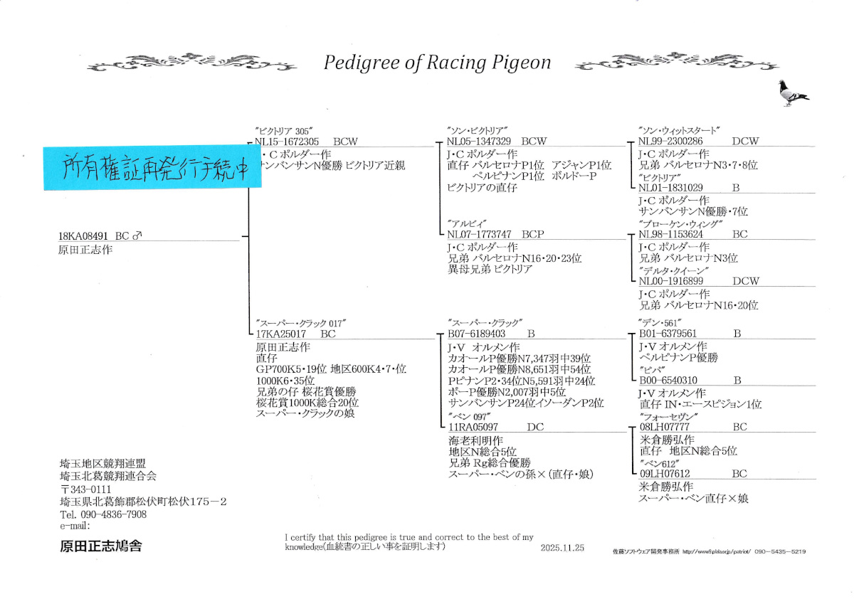 出品鳩♂11番「18KA08491 BC ♂」原田 正志鳩舎作異父兄弟にGP5位PN4位1000k6位鳩がいる ヤン・ポルダー作 バルセロナPペルピナンPアジャンP優勝の異母兄弟&ピクトリア号サンバンサンN優勝7位孫鳩×(オルメン作翔ド・クラッック号カオールP2回優勝ポーP優勝N5位×海老作ペン097号地区N総合5位) との直仔です。 父親 "ビクトリア305号"「NL15−1672305 BCW」ヤン・ポルダー鳩舎作 異母兄弟にバルセロナPペルピナンPアジャンP優勝鳩がいる ソン・ビクトリア号(ピクトリア号サンバンサンN優勝7位直仔)×アルビィ号&バルセロナN16位20位23位兄弟鳩&ビクトリア号異母兄弟鳩 との直仔です。 母親 "スーパークラック017号"「17KA25017 BC」原田 正志鳩舎作 直仔にGP700K5位地区N4位7位1000K6位35位鳩がいる オルメン作翔ド・クラッック号カオールP2回優勝ポーP優勝N5位×海老作ベン097号地区N総合5位鳩 との直仔です。 詳しくは、添付の血統書の参照をお願いいたします。 ※当該鳩の「所有権証」を粉失したために再発行手続き中です。 <備考> 現在管理人の鳩舎で元気に過ごしています。写真は1/22日に撮影しました。 菅原明鳩舎の概要はこちらをご覧ください |