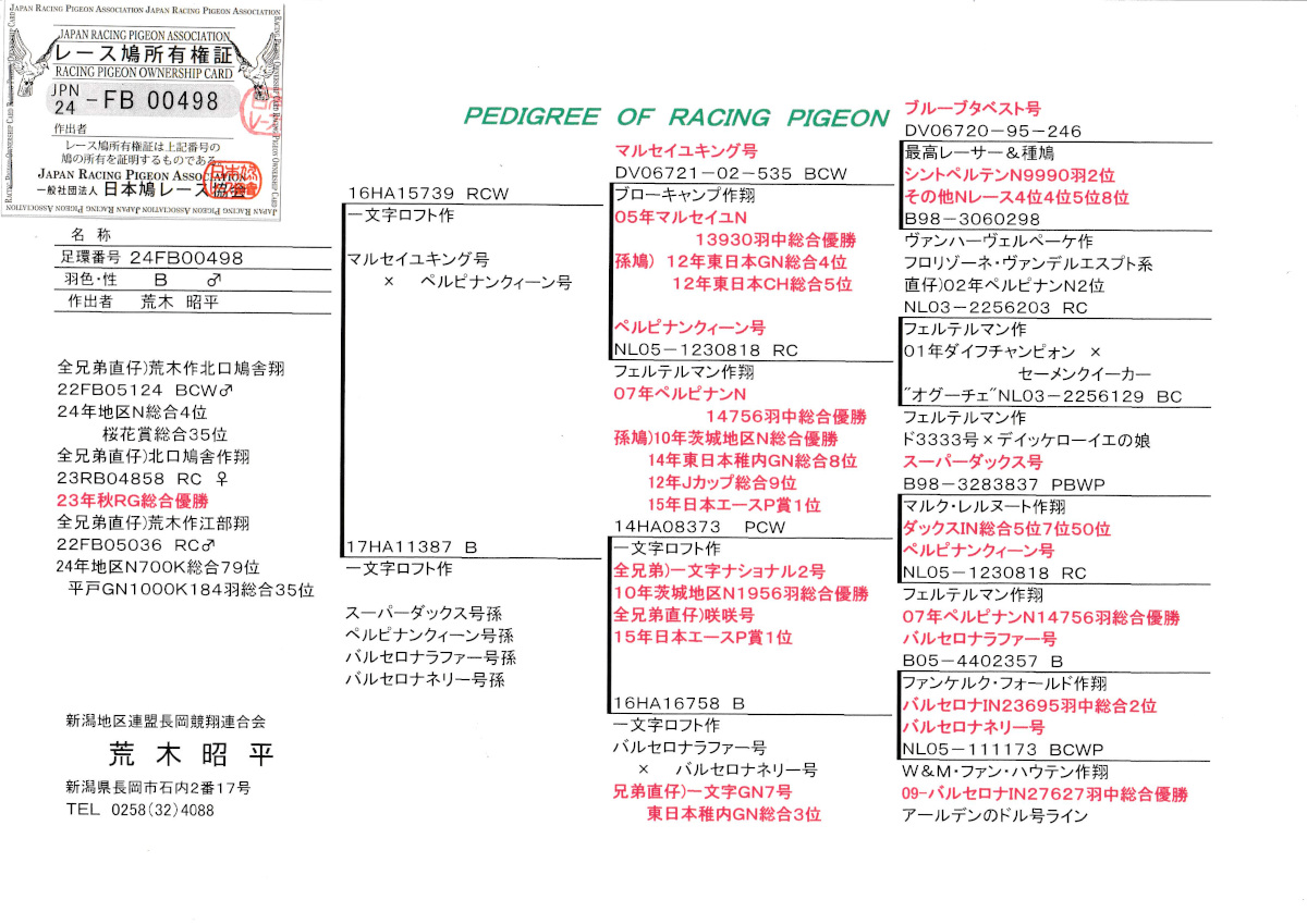 出品鳩♂71番「24FB00498 B ♂」荒木昭平鳩舎作全兄弟直仔に秋RG総合優勝 地区N600K総合4位桜花賞総合35位 平戸GN1000K総合35位鳩がいる 両親一文字作一文字ナショナル2号全兄弟×(バルセロナラファー号×バルセロナネリー号)娘鳩 との直仔です。 父親 「16HA15739 RCW」一文字ロフト作 マルセイユキング号マルセイユN総合優勝×ペルピナンクィーン号ペルピナンIN総合優勝鳩同士の直仔です。 母親 「17HA11387 B」一文字ロフト作一文字ナショナル2号全兄弟(スーパーダックス号ダックスIN5位7位×ペルピナンクィン号)×(バルセロナラファー号×バルセロナネリー号)バルセロナIN総合優勝ペァーの娘鳩 との直仔です。 詳しくは、添付の血統書の参照をお願いいたします。 <備考> 現在管理人の鳩舎で元気に過ごしています。写真は1/22日に撮影しました。 菅原明鳩舎の概要はこちらをご覧ください |