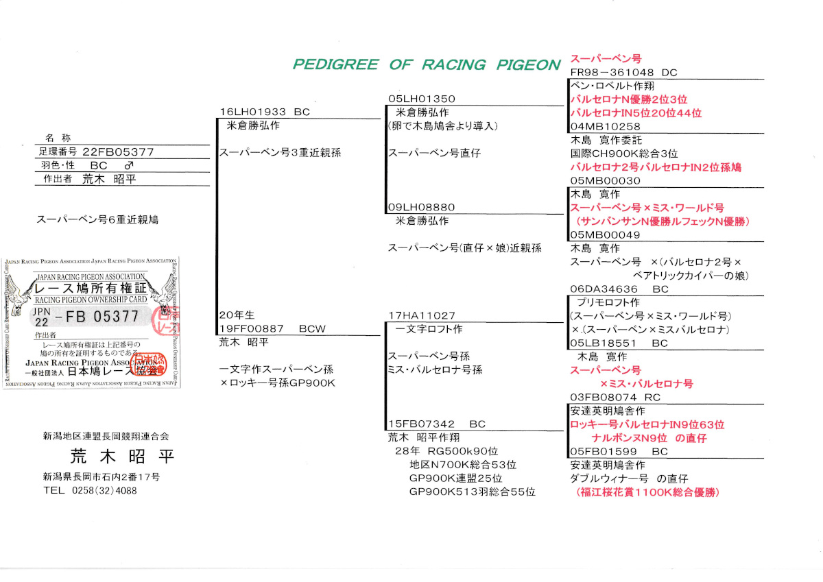 出品鳩♂42番「22FB05377 BC ♂」荒木昭平鳩舎作スーパーベン号6重近親鳩米倉作 スーパーベン号3重近親孫鳩(スーパーベン号直仔×スーパーベン号直仔同士の娘)×(スーパーベン号3重近親孫×地区N総合53位GP総合55位&ロッキー号バルセロナIN9位孫)娘鳩 との直仔です。 父親 ♂8番「16LH01933 BC ♂」米倉勝弘鳩舎作 スーパーベン号3重近親孫鳩 スーパーベン号直仔 ×(スーパーベン号・ミスワールド号の直仔×スーパーベン号の娘)娘鳩 との直仔です。 母親 ♀17番20年生「19FF00887 BCW」荒木正平鳩舎作 一文字ロフト作 スーハーベン号3重近親孫 ×地区N総合53位GP総合55位両親安達作(ロッキー号バルセロナIN9位直仔×福江桜花賞総合優勝娘)娘鳩 との直仔です。 詳しくは、添付の血統書の参照をお願いいたします。 <備考> 振込または、現金書留でお願いします。 菅原明鳩舎の概要はこちらをご覧ください |