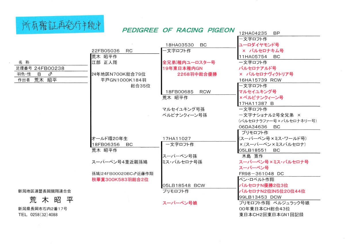 出品鳩♂66番「24FB00238 B ♂」荒木昭平鳩舎作純一文字系地区N総合79位平戸GN1000K184羽総合35位鳩×スーパーベン号4重近親孫( スーハーベン号3重近親孫×スーパーベン号娘鳩)との直仔です。 父親 「22FB05036 RC」荒木昭平鳩舎作江部鳩舎翔 地区N総合79位平戸GN1000K184羽総合35位鳩で 一文字作稚内ユーロスター号GN総合優勝全兄弟×ヘルピナンクィン号ペルピナンIN総合優勝の孫鳩 との直仔です。 母親 ♀16番20年生「18FB06356 BC」荒木昭平鳩舎作孫鳩に秋華賞300K583羽総合2位鳩がいる スーパーベン号4重近親孫( スーハーベン号3重近親孫×スーパーベン号娘鳩)との直仔です。 詳しくは、添付の血統書の参照をお願いいたします。 当該鳩の「所有権証」は再発行手続き中のため後送となります。 <備考> 振込または、現金書留でお願いします。 菅原明鳩舎の概要はこちらをご覧ください |