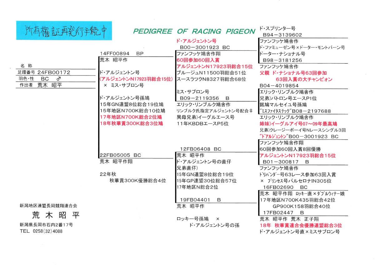 出品鳩♂61番「24FB00172 BC ♂」荒木昭平鳩舎作ド・アルジェントン号60回参加60回入賞8回優勝 アルジェントンN17923羽総合15位直仔×22年秋秋華賞300K優勝総合4位(ド・アルジェントン号近親孫)鳩 との直仔です。 父親 「14FF00894 BP」荒木昭平鳩舎作 ド・アルジェントン号60回参加60回入賞5回優勝 アルジェントンN17923羽総合15位×ミスサブロン号リンブルク作ーイーグルエース号異母兄弟鳩 との直仔です。 母親 ♀73番「22FB05005 BC ♀」荒木昭平鳩舎作翔22年秋秋華賞300K優勝総合4位鳩 ド・アルジェントン号60回参加60回入賞8回優勝アルジェントンN17923羽総合15位直仔×(地区N総合42位GP総合40位ロッキー号孫×秋華賞300K総合3位ド・アルジェントン号孫)娘鳩 との直仔です。 詳しくは、添付の血統書の参照をお願いいたします。 ※当該鳩の「所有権証」粉失したため現在再発行手続き中です。 <備考> 現在管理人の鳩舎で元気に過ごしています。写真は1/22日に撮影しました。 菅原明鳩舎の概要はこちらをご覧ください |