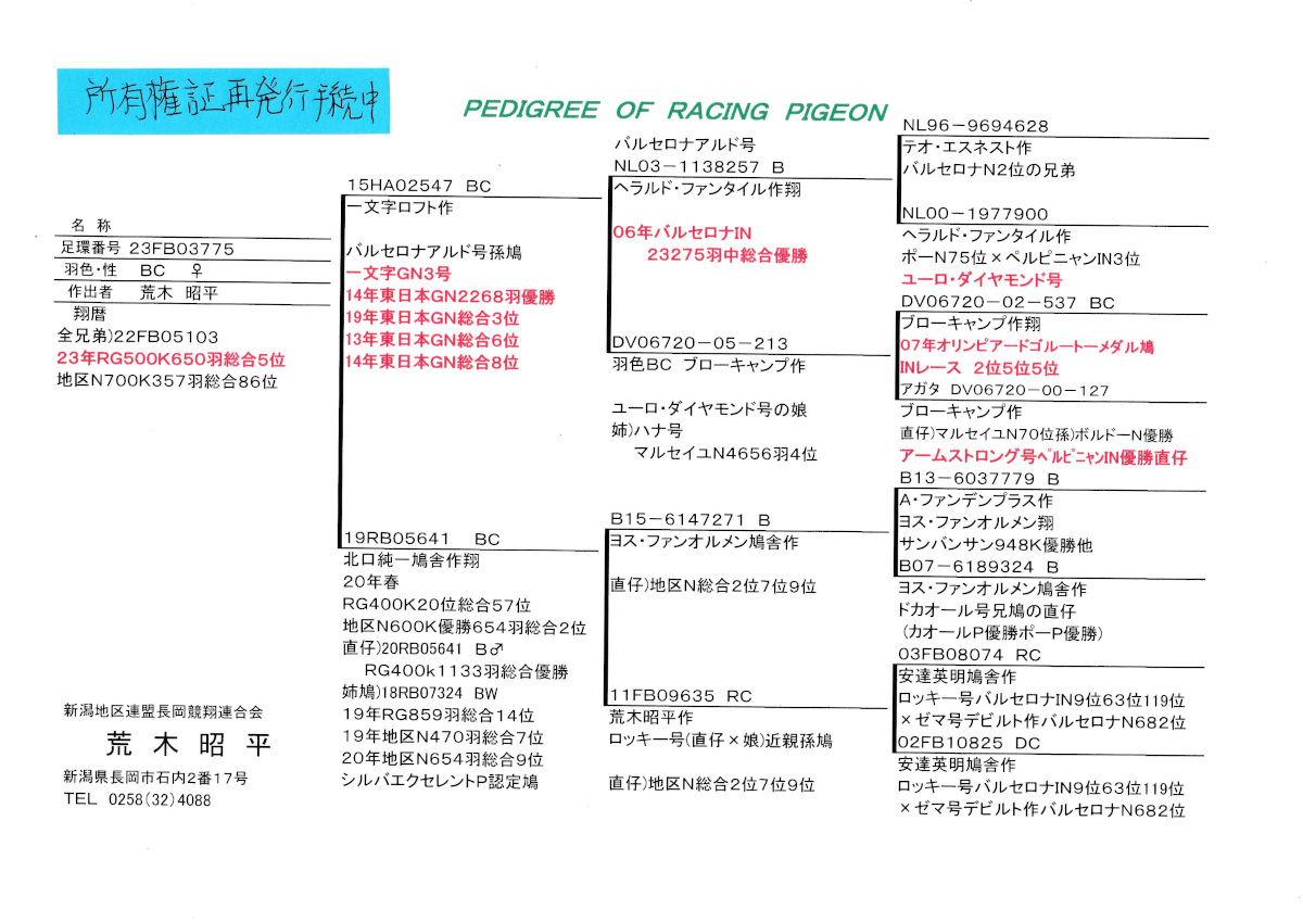 出品鳩♀34番「23FB03775 BC ♀」荒木昭平鳩舎作翔RG500K650羽総合5位地区N700K357羽総合86位鳩 異父兄弟)RG400K1133羽総合優勝鳩がいる バルセロナ・アルド号直仔×北口作翔地区N600K654羽総合2位鳩 との直仔です。 父親 「15HA02547 BC」一文字ロフト作 直仔にRG500K総合5位地区N700k総合86位鳩がいる バルセロナ・アルド号バルセロナIN総合優勝×ブローキャンプ作ユーロダイヤモンド号娘鳩 との直仔です。 母親 「19RB05641 BC」北口純一鳩舎作翔地区N600K654羽総合2位 直仔にもRG400K1133羽総合優勝鳩 姉鳩にも地区N総合7位9位シルバーエクセレントPがいる オルメン作鳩×ロッキー号近親孫鳩 との直仔です。 詳しくは、添付の血統書の参照をお願いいたします。 ※当該鳩の「所有権証」粉失したため現在再発行手続き中です。 <備考> 現在管理人の鳩舎で元気に過ごしています。写真は1/22日に撮影しました。 菅原明鳩舎の概要はこちらをご覧ください |