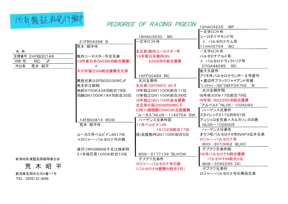 出品鳩♂58番「24FB00146 RC ♂」荒木昭平鳩舎作異父兄弟に1000K桜花賞8位総合10位入賞鳩がいる羽越GN1000K184羽総合35位異母兄弟鳩(稚内ユーロスター号全兄弟鳩×大川作福江GN総合優勝全兄弟)×(ルーカス号ペルピナンIN17位娘鳩 との直仔です。 父親 ♂32番「21FB04398 B」荒木昭平鳩舎作異母兄弟に地区N700K総合79位羽越GN1000K184羽総合35位鳩がいる 一文字ロフト作稚内ユーロスター号GN総合優勝鳩全兄弟鳩×大川作16年福江GN1100K総合優勝の全兄弟鳩 との直仔です。 母親 「14FB00814 RCW」荒木昭平鳩舎作 直仔に1000K桜花賞8位総合10位入賞鳩がいる ハーゲンス作翔ルーカス号ペルピナンIN17位鳩×デブクワ作ロジャーバルセロナ号バルセロナN優勝IN総合2位の娘鳩 との直仔です。 詳しくは、添付の血統書の参照をお願いいたします。 ※当該鳩の「所有権証」粉失したため現在再発行手続き中です。 <備考> 現在管理人の鳩舎で元気に過ごしています。写真は1/22日に撮影しました。 菅原明鳩舎の概要はこちらをご覧ください |