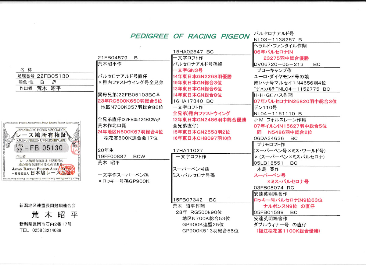出品鳩♂39番「22FB05130 B ♂」荒木昭平鳩舎作RG500K650羽総合5位異母兄弟(バルセロナ・アルド号直仔×稚内ファストウィング号兄弟)×(文字ロフト作スーハーベン号3重近親孫×地区N総合53位GP総合55位ロッキー号バルセロナIN9位孫)娘鳩 との直仔です。 父親 「21FB04579 B」荒木昭平鳩舎作異母兄弟にRG500K650羽総合5位鳩がいる 一文字作バルセロナ・アルド号バルセロナIN総合優勝直仔×プリモ作 シャーロット号東日本GN総合優勝の異母兄弟&ド・バルセロナ号の娘鳩 との直仔です。 母親 ♀17番20年生「19FF00887 BCW ♀」荒木正平鳩舎作 一文字ロフト作 スーハーベン号3重近親孫 ×地区N総合53位GP総合55位両親安達作(ロッキー号バルセロナIN9位直仔×福江桜花賞総合優勝娘)娘鳩 との直仔です。 詳しくは、添付の血統書の参照をお願いいたします。 <備考> 現在管理人の鳩舎で元気に過ごしています。写真は1/22日に撮影しました。 菅原明鳩舎の概要はこちらをご覧ください |