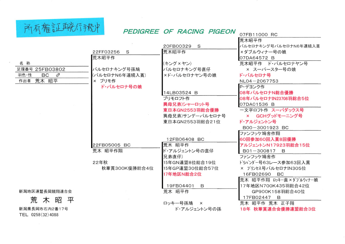 出品鳩若2番「25FB03802 BC」荒木昭平鳩舎作(バルセロナキング号バルセロナ6年連続入賞鳩&バルセロナヤン号バルセロナIN79位鳩の孫×シャーロット号東日本GN総合優勝の異母兄弟)直仔×22年秋秋華賞300K優勝総合4位(ド・アルジェントン号近親孫)鳩 との直仔です。 父親 ♂44番「22FF03256 S ♂」荒木昭平鳩舎作 (バルセロナキング号バルセロナ6年連続入賞直仔×ド・バルセロナヤン号バルセロナIN79位娘)直仔×シャーロット号東日本GN総合優勝の異母兄弟(ド・バルセロナ号バルセロナN優勝IN5位の娘)娘鳩 との直仔です。 母親 ♀73番「22FB05005 BC ♀」荒木昭平鳩舎作翔22年秋秋華賞300K優勝総合4位鳩 ド・アルジェントン号60回参加60回入賞8回優勝アルジェントンN17923羽総合15位直仔×(地区N総合42位GP総合40位ロッキー号孫×秋華賞300K総合3位ド・アルジェントン号孫)娘鳩 との直仔です。 詳しくは、添付の血統書の参照をお願いいたします。 ※当該鳩の「所有権証」粉失したため現在再発行手続き中です。 <備考> 振込または、現金書留でお願いします。 菅原明鳩舎の概要はこちらをご覧ください |