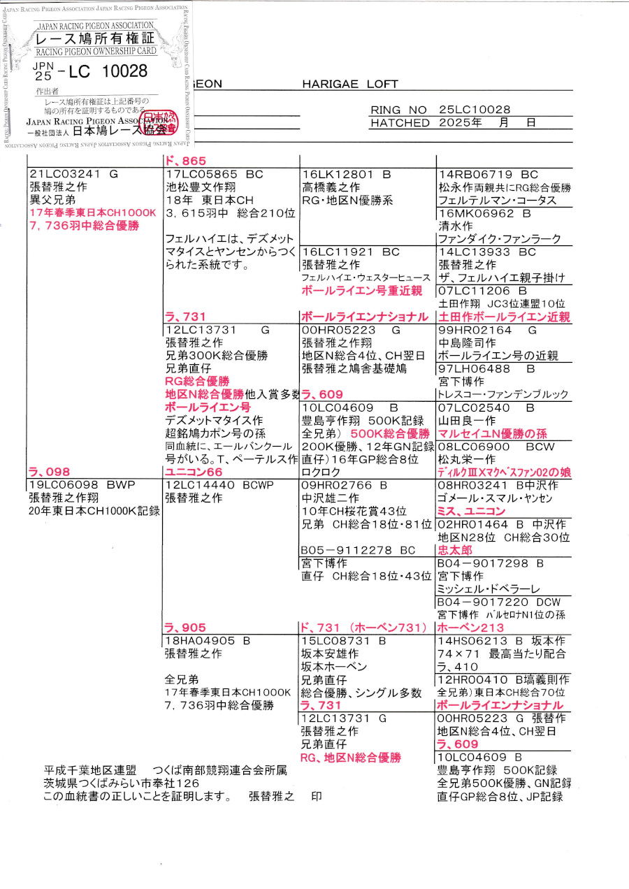 出品鳩若74番「25LC10028 BW」張替雅之作テルヨ汐見号東日本CH総合優勝異母兄弟×ラ098号東日本CH帰還鳩(ユニコン440号×ラ905号) ![]() |