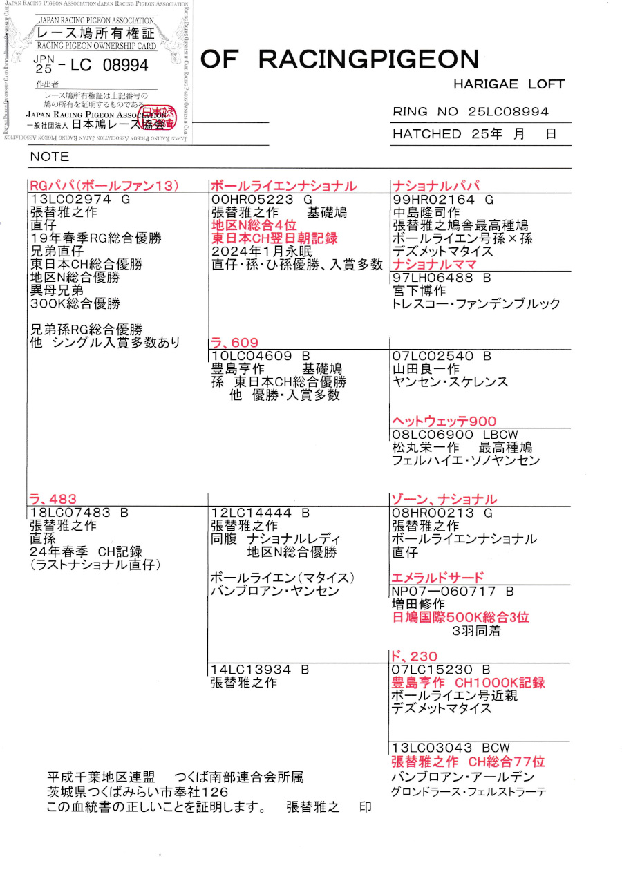 出品鳩若48番 「25LC08994 B」張替雅之鳩舎作異母兄弟に19年沼宮内RG2549羽総合優勝鳩がいる ボールライエンファン13号(基礎鳩ボールエンナショナル号直仔)×ラ483号(地区N総合優勝の同腹&基礎鳩ボールライエンナショナル号孫鳩×東日本CH総合77位の娘)娘鳩 との直仔です。 父親 "ボールライエンファン13"「13LC02974 G」張替雅之鳩舎作 直仔に19年春RG総合優勝 兄弟直仔に東日本CH総合優勝地区N総合優勝鳩がいる 基礎鳩ボールエンナショナル号地区N総合4位×ラ609号 との直仔です。 母親 ♀5番"ラ483号"「18LC07483 B」張替雅之鳩舎作 地区N総合優勝の同腹(基礎鳩ボールライエンナショナル号孫鳩) ×(東日本CH1000K×東日本CH総合77位)娘鳩 との直仔です。 詳しくは、添付の血統書の参照をお願いいたします。 <備考> 現在管理人の鳩舎で元気に過ごしています。写真は1/24日に撮影しました。 菅原明鳩舎の概要はこちらをご覧ください |