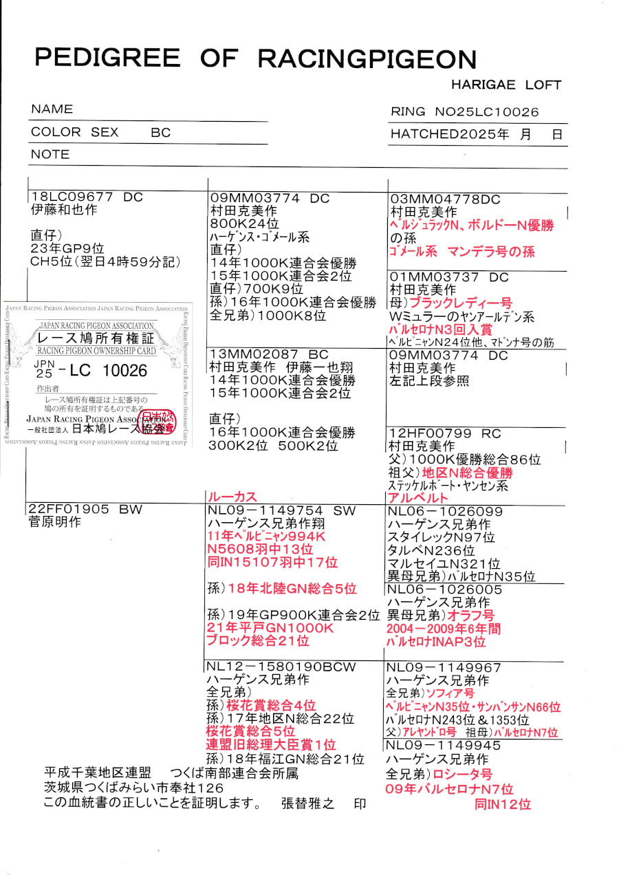 出品鳩若73番「25LC10026 BC」張替雅之作半兄弟)GP9位CH5位伊藤作1000K優勝兄弟(1000K連合会優勝2位直仔)×純ハーゲンス系ルーカス号娘鳩 ![]() |