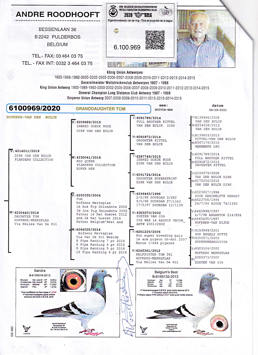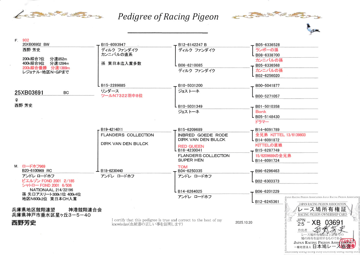 出品鳩「25XB03691 BC」西野芳史鳩舎作200K総合優勝総合7位 400K総合9位(D・ファンダイク作カンニバル号近親鳩 ×リンダース作翔ツールN7322羽8位)×ロードホフ作翔ビェルゾン185羽2位シャトロー506羽N22196羽214位鳩(キッテル号全兄弟の孫×代表鳩トム号の娘) との直仔です。 父親 "902号"「20XB06902 BW」西野芳史鳩舎作委託 200K総合優勝総合7位 400K総合9位GP700K迄 D・ファンダイク作カンニバル号近親鳩 ×リンダース作翔両親ヨストーネ作ツールN7322羽8位鳩 との直仔です。 母親 ”ロードホフ969号”「B20−6100969 RC」A・ロードホフ鳩舎作翔ビェルゾン185羽2位シャトロー506羽6位N22196羽214位鳩で キッテル号全兄弟の孫 ×代表鳩トム号の娘鳩 との直仔です。 詳しくは、血統書を参照してください。 <備考> 現在管理人の鳩舎で元気に暮らしています。写真1/24日に撮影しました。 菅原明鳩舎の概要はこちらをご覧ください |