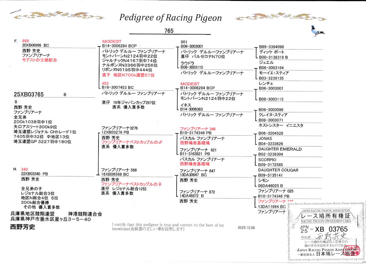 出品鳩「25XB03765 B」西野作全兄弟)200k優勝RG総合32位 ファンブリアーナ系モントバーンN22位ジャルナックN74位直仔×西野ファンブリアーナベストC娘 ![]() |