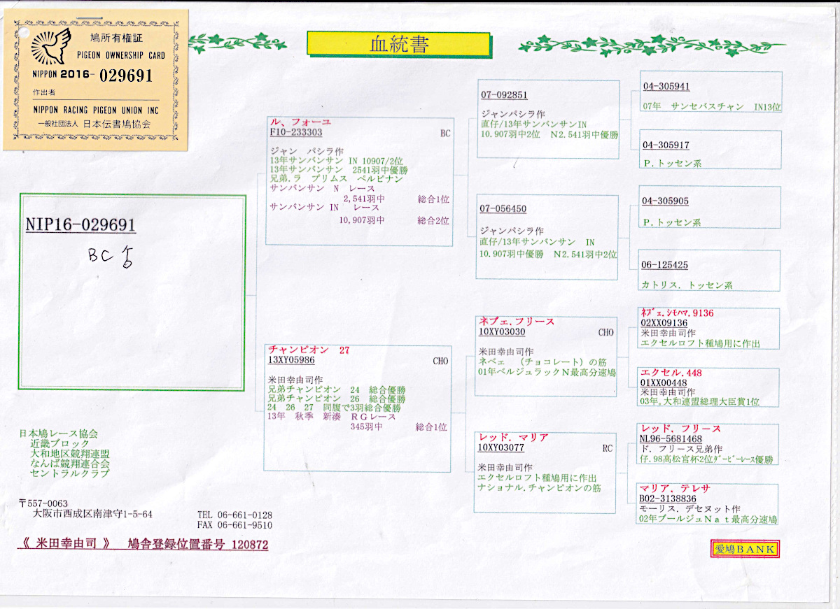 出品鳩「日16−029691 BC♂」米田作ジャンパシラ作ラ・プリズムペルピナン号 サンバンサンN優勝IN総合2位兄弟×チャンピオン27号秋新湊RG総合優勝鳩 ![]() |