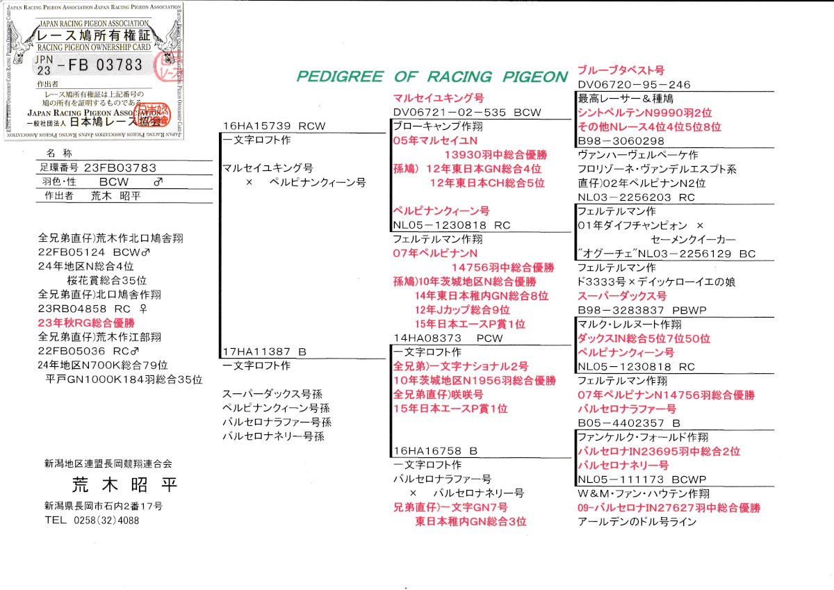出品鳩♂51番「23FB03783 BCW ♂」荒木昭平鳩舎作全兄弟直仔に秋RG総合優勝 地区N600K総合4位桜花賞総合35位 平戸GN1000K総合35位鳩がいる 両親一文字作一文字ナショナル2号全兄弟×(バルセロナラファー号×バルセロナネリー号)娘鳩 との直仔です。 父親 「16HA15739 RCW」一文字ロフト作 マルセイユキング号マルセイユN総合優勝×ペルピナンクィーン号ペルピナンIN総合優勝鳩同士の直仔です。 母親 「17HA11387 B」一文字ロフト作一文字ナショナル2号全兄弟(スーパーダックス号ダックスIN5位7位×ペルピナンクィン号)×(バルセロナラファー号×バルセロナネリー号)バルセロナIN総合優勝ペァーの娘鳩 との直仔です。 詳しくは、添付の血統書の参照をお願いいたします。 <備考> 現在管理人の鳩舎で元気に過ごしています。写真は1/29日に撮影しました。 菅原明鳩舎の概要はこちらをご覧ください |