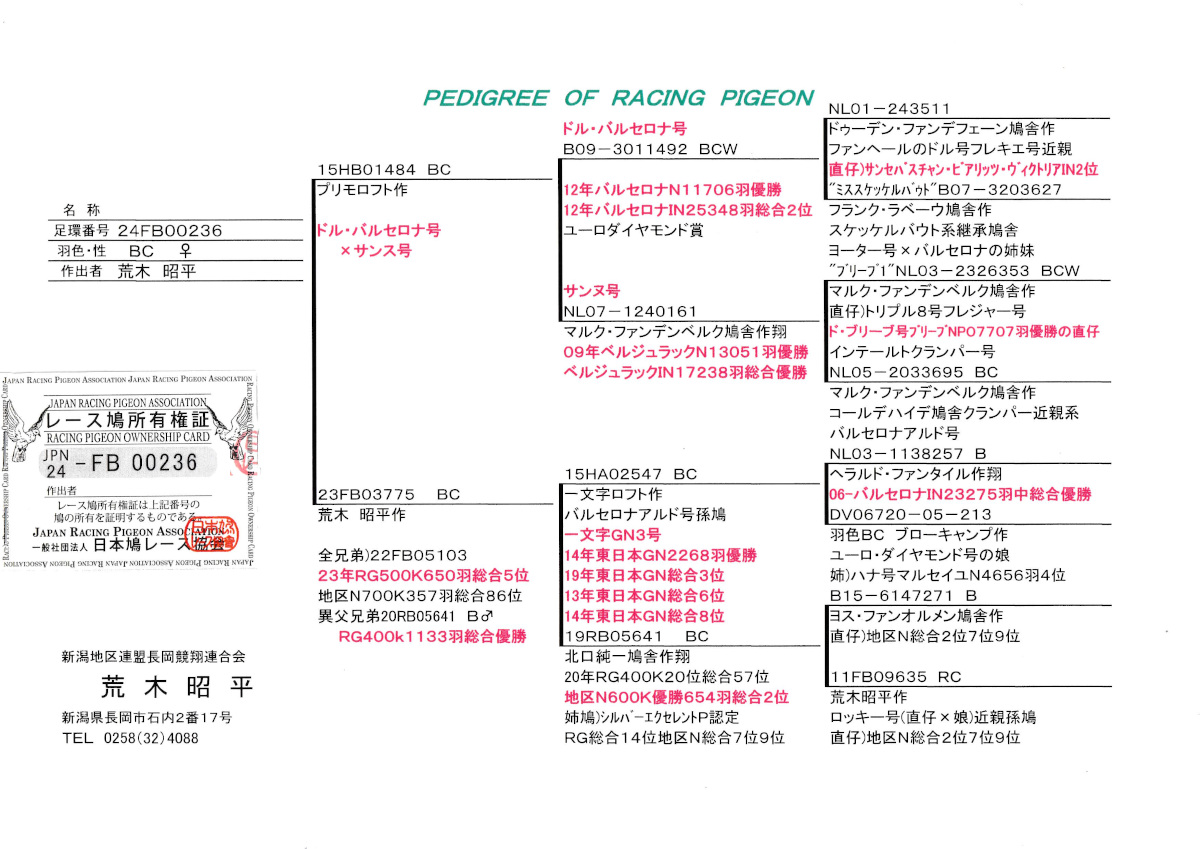 出品鳩♀56番「24FF00236 BC ♀」荒木昭平鳩舎作プリモロフト作 ドルバルセロナ号バルセロナN優勝IN25348羽総合2位直仔×RG500K650羽総合5位全兄弟(バルセロナアルド号孫)鳩 との直仔です。 父親 「15HB01484 BC」プリモロフト作 ドルバルセロナ号バルセロナN優勝IN25348羽総合2位×サンヌ号ベルジュラックIN17238羽総合優勝鳩 との直仔です。 母親♀34番「23FB03775 BC ♀」荒木昭平鳩舎作 全兄弟にRG500K650羽総合5位地区N700K357羽総合86位鳩 異父兄弟にRG400K1133羽総合優勝鳩がいる バルセロナ・アルド号直仔×北口作翔地区N600K654羽総合2位鳩 との直仔です。 詳しくは、添付の血統書の参照をお願いいたします。 <備考> 現在管理人の鳩舎で元気に過ごしています。写真は1/29日に撮影しました。 菅原明鳩舎の概要はこちらをご覧ください |