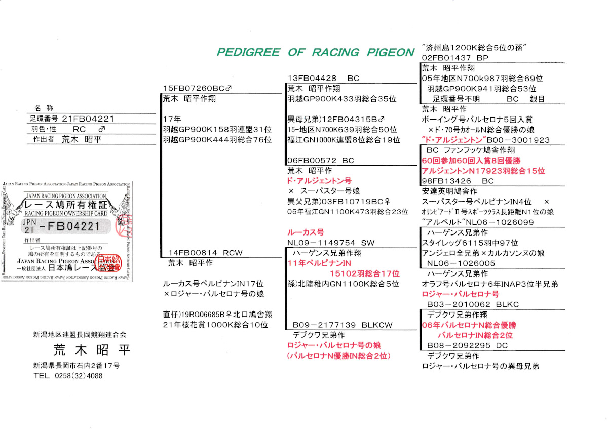 出品鳩♂29番「21FB04221 RC ♂」荒木昭平鳩舎作 異母兄弟に1000K桜花賞8位総合10位入賞鳩がいる 17年羽越GP900K158羽連盟31位444羽総合76位&ド・アルジェントン号孫鳩×ルーカス号ペルピナンIN17位娘鳩 との直仔です。 父親 「15FB07260 BC」荒木昭平鳩舎作翔 17年羽越GP900K158羽連盟31位444羽総合76位鳩で GP900K総合35位(済州島1200K総合5位ライン)×ド・アルジェントン号アルジェントンB17923羽15位の娘鳩 との直仔です。 母親 「14FB00814 RCW」荒木昭平鳩舎作 直仔に1000K桜花賞8位総合10位入賞鳩がいる ハーゲンス作翔ルーカス号ペルピナンIN17位鳩×デブクワ作ロジャーバルセロナ号バルセロナN優勝IN総合2位の娘鳩 との直仔です。 詳しくは、添付の血統書の参照をお願いいたします。 <備考> 現在管理人の鳩舎で元気に過ごしています。写真は1/29日に撮影しました。 菅原明鳩舎の概要はこちらをご覧ください |