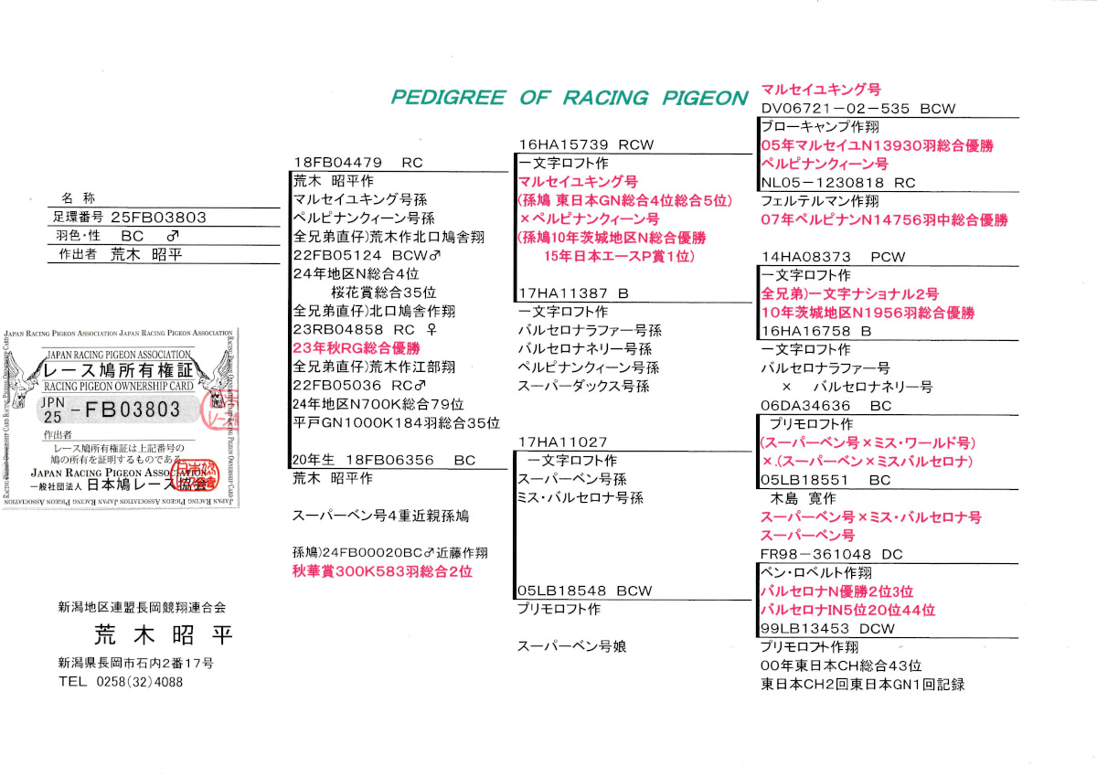 出品鳩若3番「25FB03803 BC」荒木昭平作両親一文字作(一文字ナショナル2号全兄弟×バルセロナラファー号&ネリー号娘)×スーパーベン号4重近親孫 ![]() |