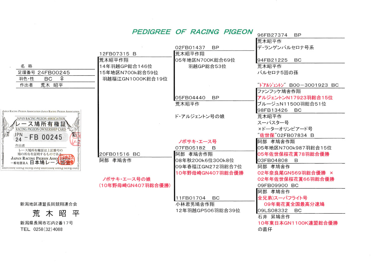 出品鳩♀59番「24FB00245 BC ♀」荒木昭平鳩舎作福江GN1000K総合19位地区N総合59位羽越GP総合146位鳩 ×阿部作ノボサキエース号野母崎GN407羽総合優勝福江GN総合7位の娘鳩 との直仔です。 父親 「12FB07315 B」荒木昭平鳩舎作翔 福江GN1000K総合19位地区N総合59位羽越GP総合146位鳩で 地区N総合69位GP総合53位鳩×ドアルジェントン号60回参加60回入賞8回優勝アルジェントンN17923羽15位の娘鳩 との直仔です。 母親 「20FB01516 BC」阿部 孝鳩舎作 ノボサキエース号野母崎GN407羽総合優勝福江GN総合7位鳩 × 小林作翔羽越GP506羽総合39位鳩 との直仔です。 詳しくは、添付の血統書の参照をお願いいたします。 <備考> 現在管理人の鳩舎で元気に過ごしています。写真は1/29日に撮影しました。 菅原明鳩舎の概要はこちらをご覧ください |