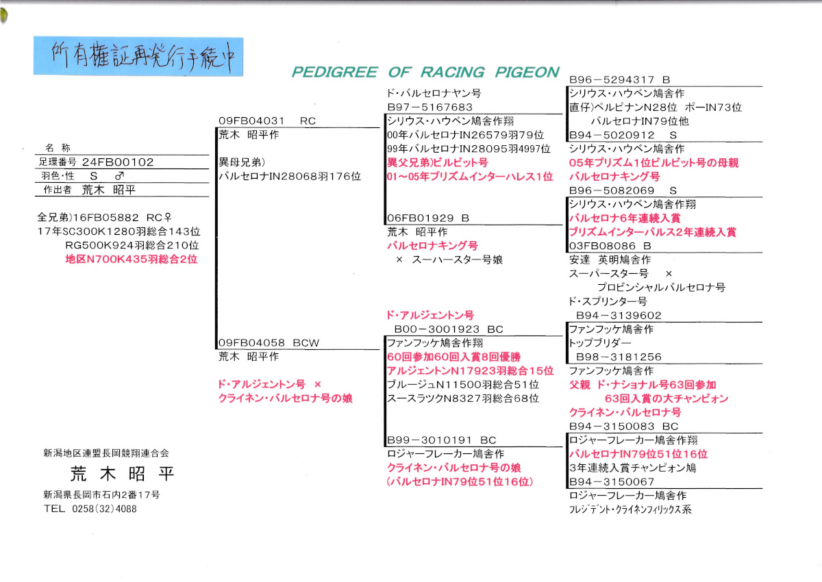 出品鳩リスト外「24FB00102 S♂」荒木昭平作全兄弟に 地区N700K435羽総合2位 バルセロナヤン号直仔×ド・アルジェントン号娘 ![]() |