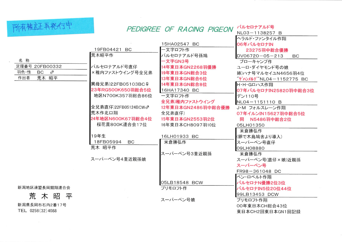 出品鳩♂18番「20FB00332 BC♂」荒木昭平作RG総合5位半兄弟(バルセロナアルド号直仔×稚内ファストウング号兄弟)×スーパーベン号4重近親孫鳩 ![]() |