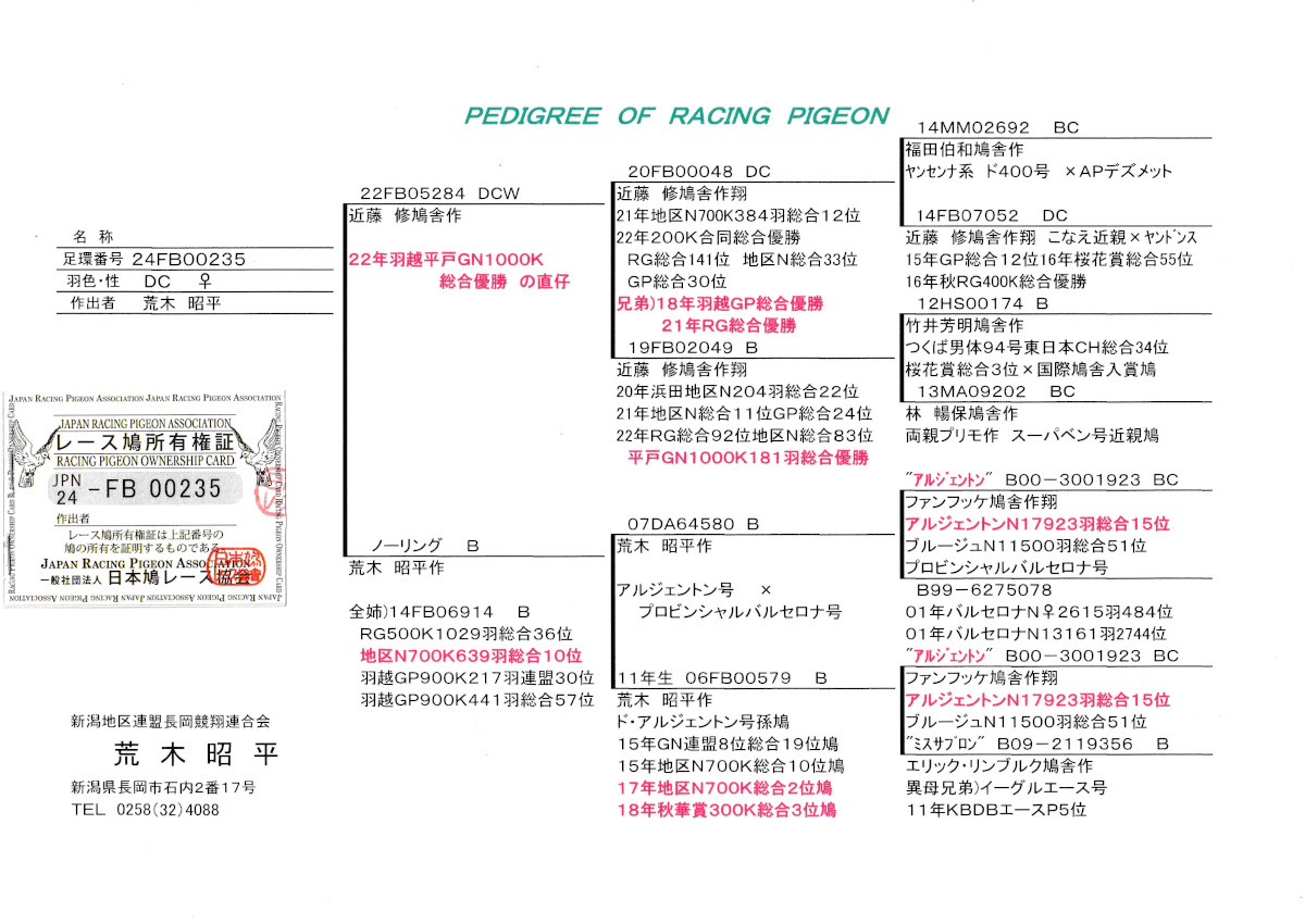 出品鳩♀55番「24FB00235 DC ♀」荒木昭平鳩舎作 近藤作(22年平戸GN181羽総合優勝地区N700K総合11位22位×地区N総合12位33位GP総合30位)直仔×地区N700K639羽総合10位羽越GP900k総合57位全兄弟(ド・アルジェントン号直仔×直娘)鳩 との直仔です。 父親 ♂40番「22FB05284 DCW ♂」近藤 修鳩舎作22年平戸GN181羽総合優勝 地区N700K総合11位22位 GP総合24位入賞鳩×地区N総合12位33位GP総合30位入賞鳩 同士の直仔です。 母親 「ノーリング B」荒木昭平鳩舎作 全兄弟にRG500K1029羽総合36位地区N700K639羽総合10位羽越GP900k総合57位鳩がいる アルジェントン号60回参加60回入賞8回優勝アルジェントンN17923羽総合15位(直仔×娘)の異母兄弟交配の直仔です。 詳しくは、添付の血統書の参照をお願いいたします。 <備考> 振込または、現金書留でお願いします。 菅原明鳩舎の概要はこちらをご覧ください |