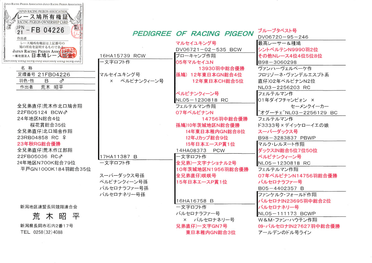出品鳩♂30番「21FB04226 B ♂」荒木昭平鳩舎作全兄弟直仔に秋RG総合優勝 地区N600K総合4位桜花賞総合35位 平戸GN1000K総合35位鳩がいる 両親一文字作一文字ナショナル2号全兄弟×(バルセロナラファー号×バルセロナネリー号)娘鳩 との直仔です。 父親 「16HA15739 RCW」一文字ロフト作 マルセイユキング号マルセイユN総合優勝×ペルピナンクィーン号ペルピナンIN総合優勝鳩同士の直仔です。 母親 「17HA11387 B」一文字ロフト作一文字ナショナル2号全兄弟(スーパーダックス号ダックスIN5位7位×ペルピナンクィン号)×(バルセロナラファー号×バルセロナネリー号)バルセロナIN総合優勝ペァーの娘鳩 との直仔です。 詳しくは、添付の血統書の参照をお願いいたします。 <備考> 現在管理人の鳩舎で元気に過ごしています。写真は1/29日に撮影しました。 菅原明鳩舎の概要はこちらをご覧ください |