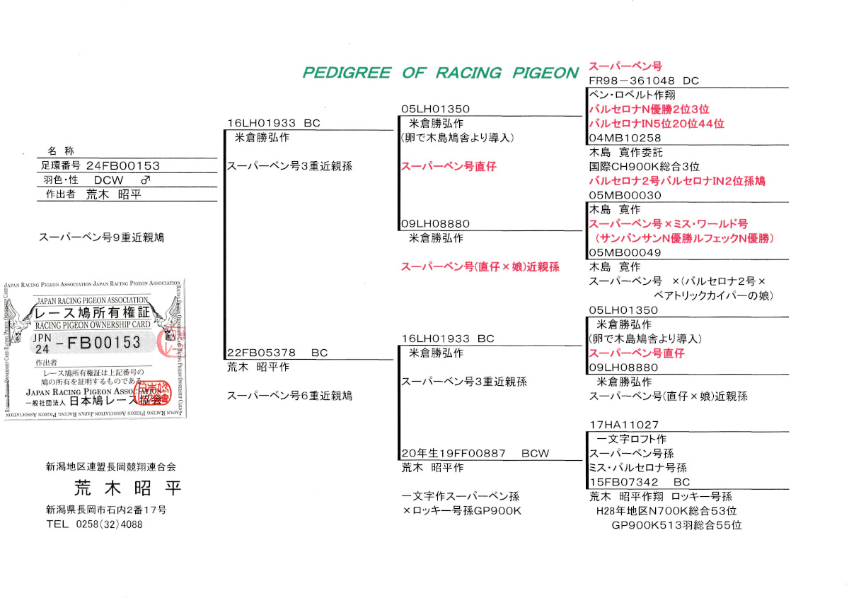 出品鳩♂60番「24FB00153 DCW ♂」荒木昭平鳩舎作スーパーベン号9重近親鳩米倉作 スーパーベン号3重近親孫鳩(スーパーベン号直仔×スーパーベン号直仔同士の娘)×(スーパーベン号3重近親孫×スーパーベン号3重近親)娘鳩 との直仔です。 父親 ♂8番「16LH01933 BC ♂」米倉勝弘鳩舎作 スーパーベン号3重近親孫鳩 スーパーベン号直仔 ×(スーパーベン号・ミスワールド号の直仔×スーパーベン号の娘)娘鳩 との直仔です。 母親 ♀26番「22FB05378 BC」荒木昭平鳩舎作スーパーベン号6重近親鳩米倉作 スーパーベン号3重近親孫鳩(スーパーベン号直仔×スーパーベン号直仔同士の娘)×(スーパーベン号3重近親孫×地区N総合53位GP総合55位&ロッキー号バルセロナIN9位孫)娘鳩 との直仔です。 詳しくは、添付の血統書の参照をお願いいたします。 <備考> 現在管理人の鳩舎で元気に過ごしています。写真は1/29日に撮影しました。 菅原明鳩舎の概要はこちらをご覧ください |