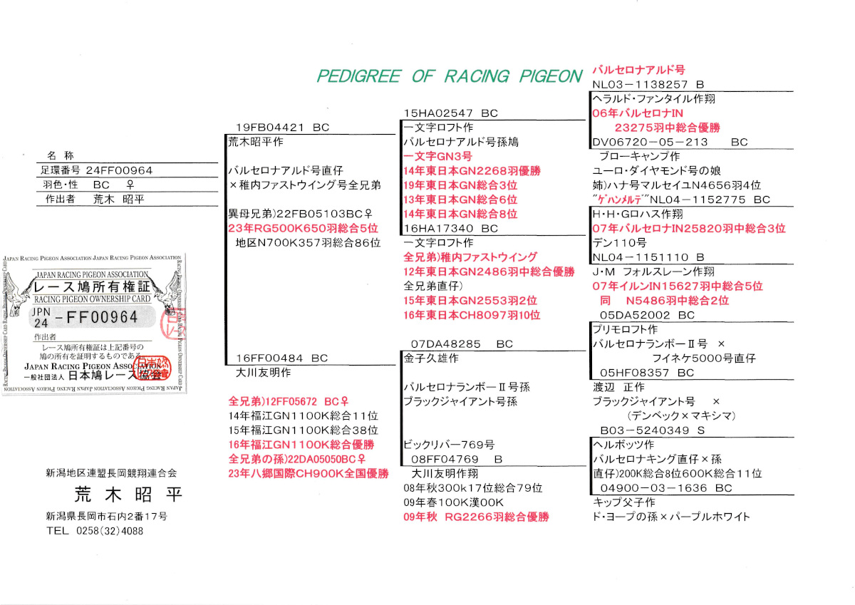 出品鳩♀72番「24FF00964 BC ♀」荒木昭平鳩舎作RG500K650羽総合5位異母兄弟(バルセロナ・アルド号直仔×稚内ファストウィング号兄弟)×大川作 ビックリバーGN672号福江GN総合優勝総合11位総合38位の全兄弟鳩 との直仔です。 父親 ♂15番「19FB04421 BC ♂」荒木昭平鳩舎作 異母兄弟にRG500K650羽総合5位鳩がいる 両親一文字作バルセロナ・アルド号バルセロナIN総合優勝直仔×稚内ファストウィング号12年東日本GN2486羽総合優勝の全兄弟鳩 との直仔です。 母親 ♀5番「16FF00484 BC」大川友明鳩舎作 ビックリバーGN672号16年福江GN1100K総合優勝14年総合11位15年総合38位の全兄弟鳩で (プリモ作バルセロナランボーU号直仔×渡辺作ブラックジャンアント号娘)直仔×ビックリバー769号秋RG2266羽総合優勝鳩 との直仔です。 詳しくは、添付の血統書の参照をお願いいたします。 <備考> 振込または、現金書留でお願いします。 菅原明鳩舎の概要はこちらをご覧ください |