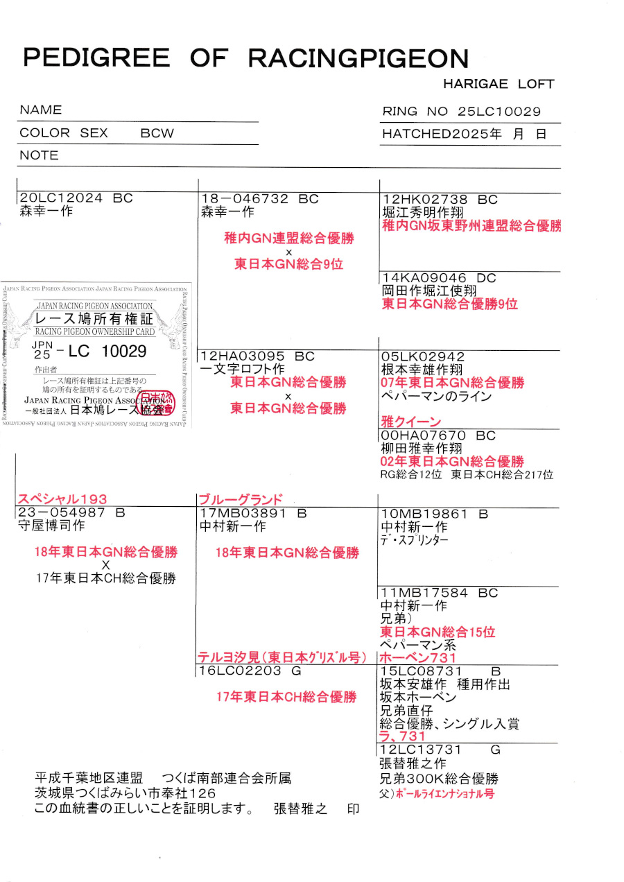 出品鳩若75番「25LC10029 BCWP」張替雅之作(GN連盟優勝&GN総合9位直仔X根本作&柳田作GN総合優勝娘)×(ブルーグランド号×テルヨ汐見号CH総合優勝) ![]() |