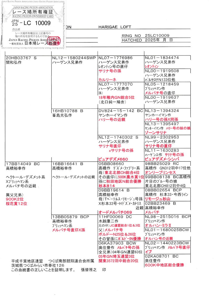 出品鳩若63番「25LC10009 S」張替作関作(ハーゲンス作サリナ近親&カルリーナ号ポーN入賞娘×ハリー近親&サリナ近親)×高橋作桜花賞12位半兄弟&Hデスメ近親 ![]() |