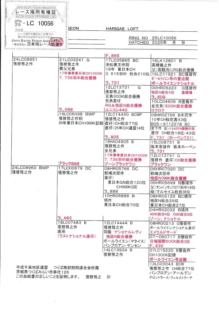 出品鳩若97番「25LC10056 BW」張替雅之作(テルヨ汐見号CH総合優勝半兄弟×CH帰還鳩&テルヨ汐見全兄弟娘)×(CH総合70位直仔×CH総合77位娘) ![]() |