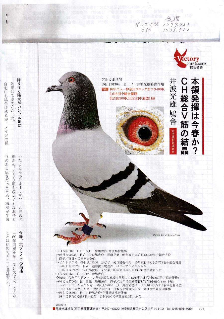 出品鳩♂2番"アルカポネ号"「16ET01304 B♂」井波光雄鳩舎作翔 16年秋RG400K470羽総合優勝ブロック2616羽総合優勝鳩 ![]() |