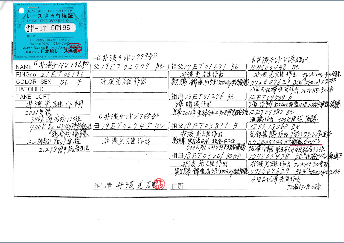 出品鳩♀27番「21ET00196 BC♀」井波光雄作翔21年秋RG400K484羽総合2位ブロック2298羽総合3位 井波チンドン779号×井波チンドン745号 ![]() |