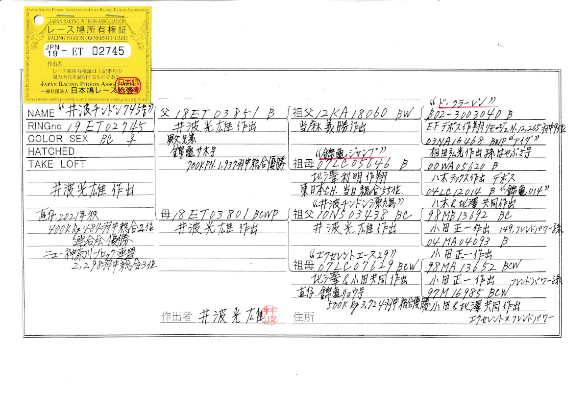 出品鳩 "井波チンドン745号"♀19番「19ET02745 BC ♀」井波光雄鳩舎作直仔に21年秋RG400K484羽総合2位ブロック2298羽総合3位鳩がいる 錦亀サホ号地区N700K総合優勝異父兄弟&錦亀ジャンプ号東日本CH当日総合55位直仔×(井波チンドン系源鳩×エクセレントエース29号錦亀リョウ号母親)娘鳩 との直仔です。 父親 「18ET03851 B」井波光雄鳩舎作 異父兄弟に 錦亀サポ号地区N700K総合優勝鳩がいる 当麻作ド・クラーレン号リモージュN12265羽9位直仔×錦亀ジャンプ号東日本CH当日総合55位鳩 との直仔です。 母親 ♀11番「18ET03801 BCWP」井波光雄鳩舎作 井波チンドン系源鳩(小田チンドン692号×小田チンドン093号)×エクセレントエース29号小田・北澤作錦亀リョウ号母親 との直仔です。 詳しくは、血統書を参照してください。 <備考> 振込または、現金書留でお願いします。 菅原明鳩舎の概要はこちらをご覧ください |