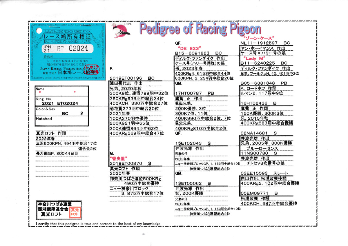 出品鳩♀28番「21ET02024 BC♀」井波光雄作翔22年PN600K2位494羽総合17位GP800K4日目 香央理号RG500Kつばさ連盟総合優勝直仔 ![]() |