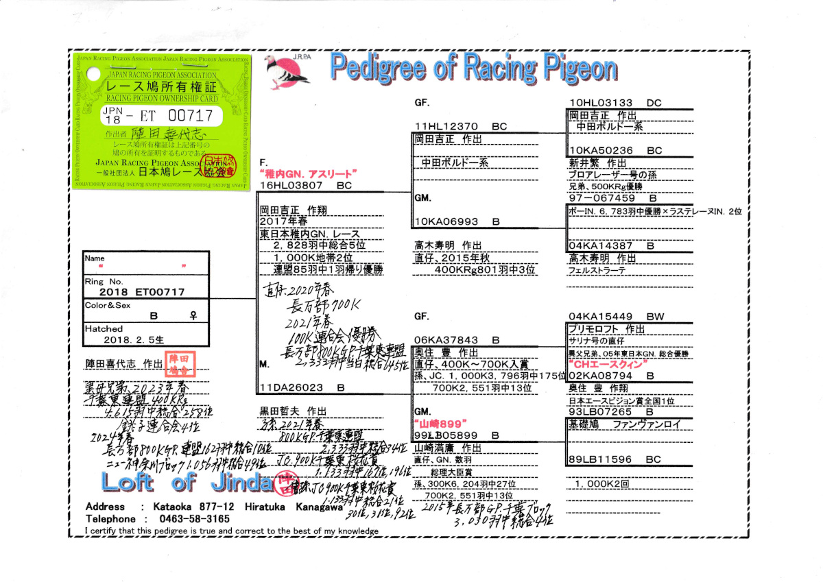 出品鳩♀10番「18ET00717 B♀」陣田喜代志作半兄弟)GP800K連盟10位 稚内GNアスリート号東日本GN総合5位×CHエースクィン号日本AP全国1位孫鳩 ![]() |