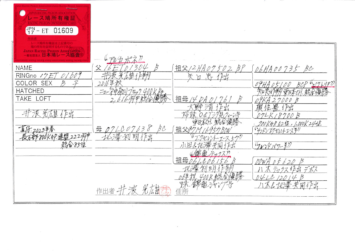 出品鳩♀5番「17ET01609 B♀」井波作直仔)GP800K連盟85位 アルカポネ号ブロック400K2616羽総合優勝鳩×北澤作(エクセレントエース号×錦亀テックス号) ![]() |