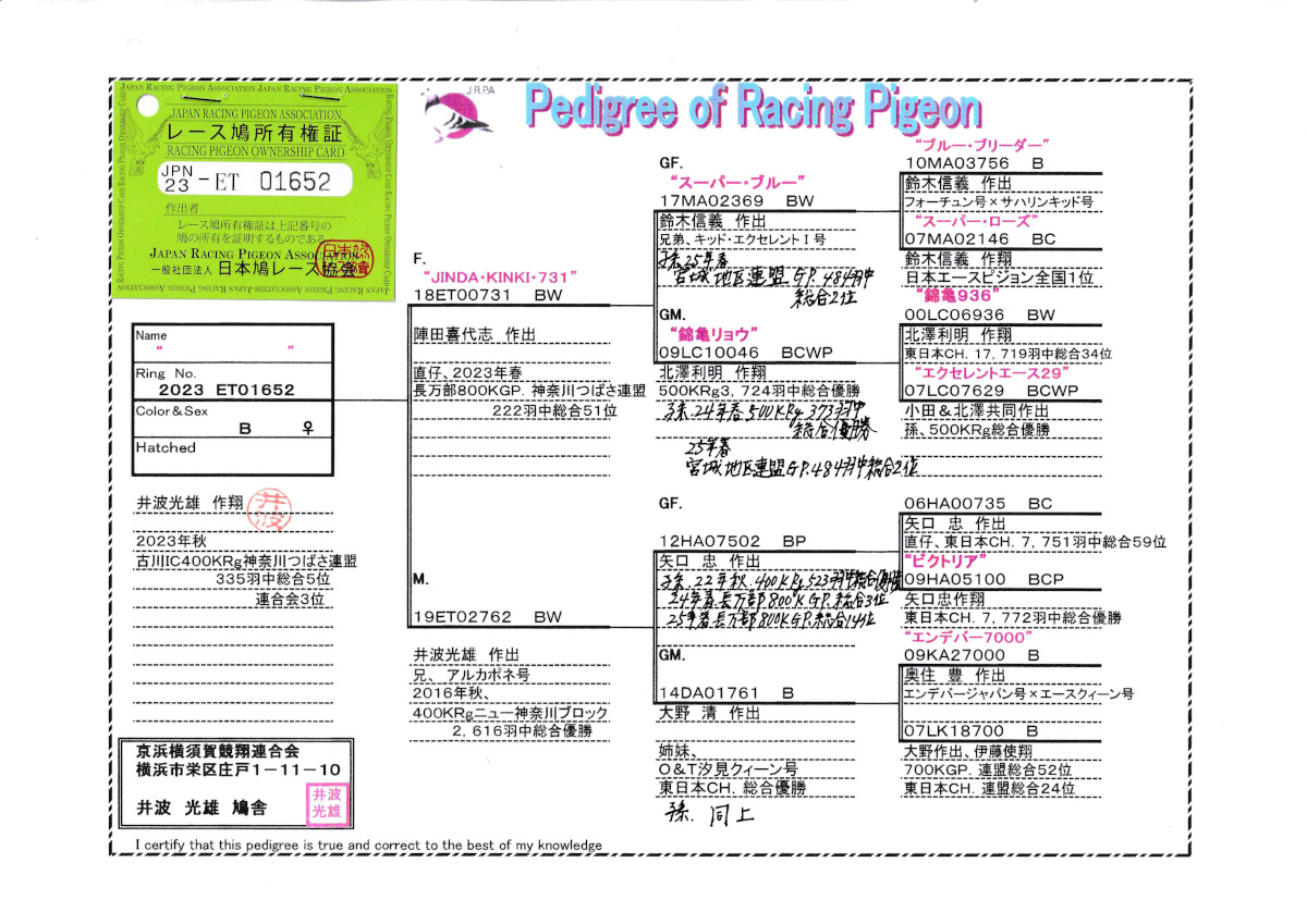 | 出品鳩♀34番「23ET01652 B♀」井波光雄作翔23年秋RG400K総合5位 錦亀リョウ号RG500K総合優勝直仔×アルカポネ号400K総合優勝全兄弟 | オークションNo: 1770280267 |